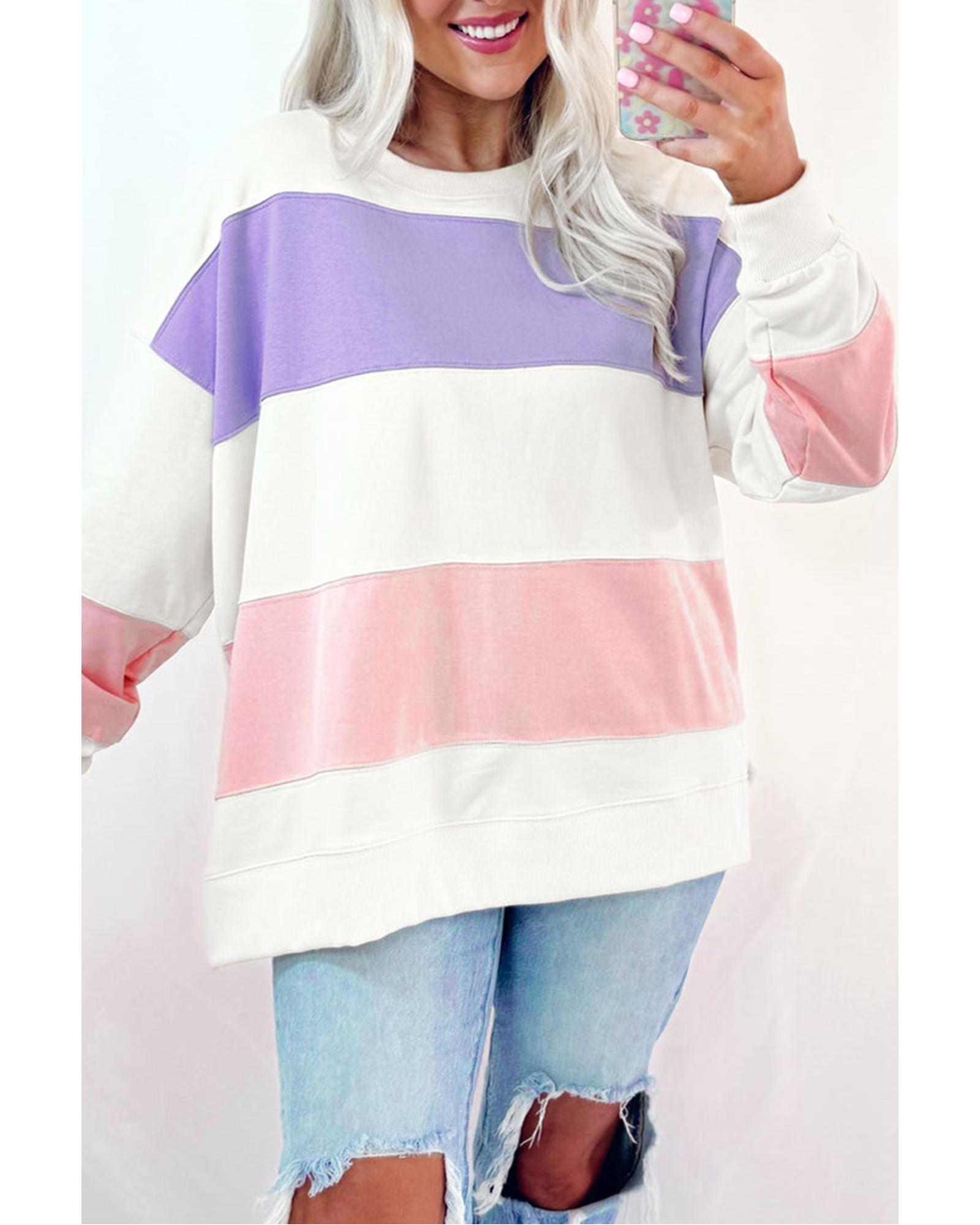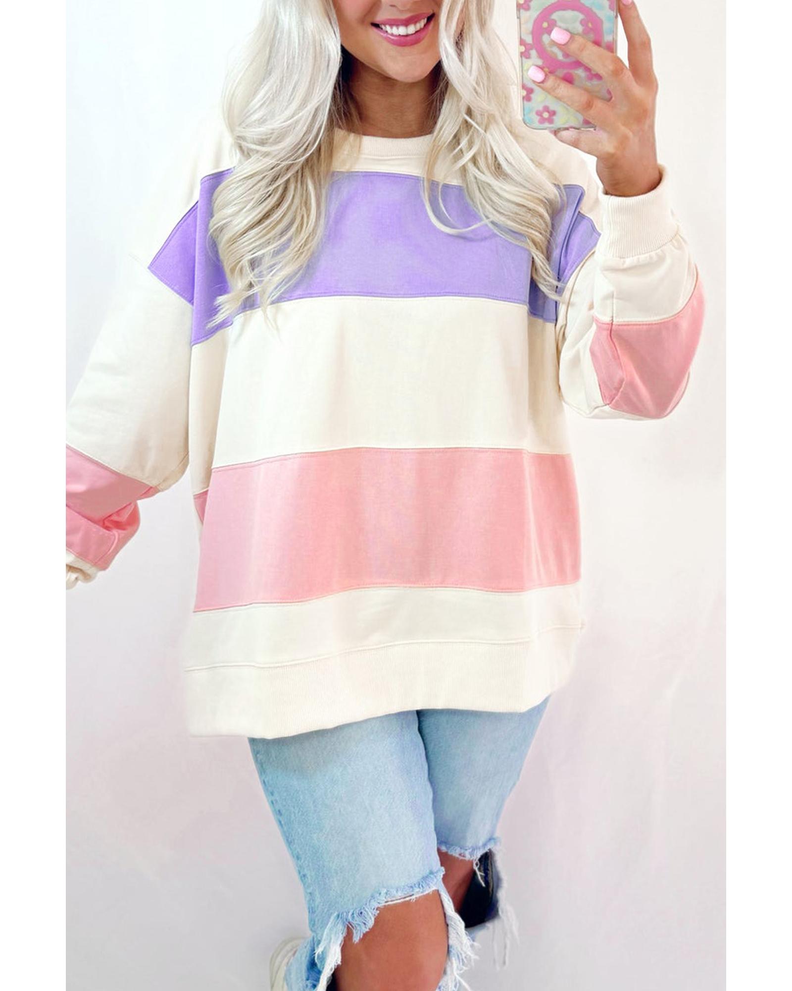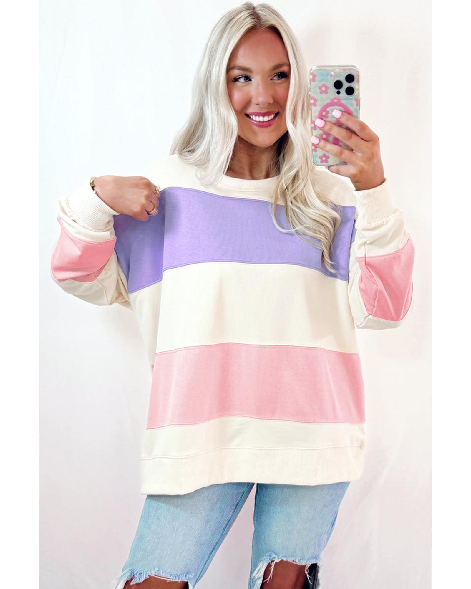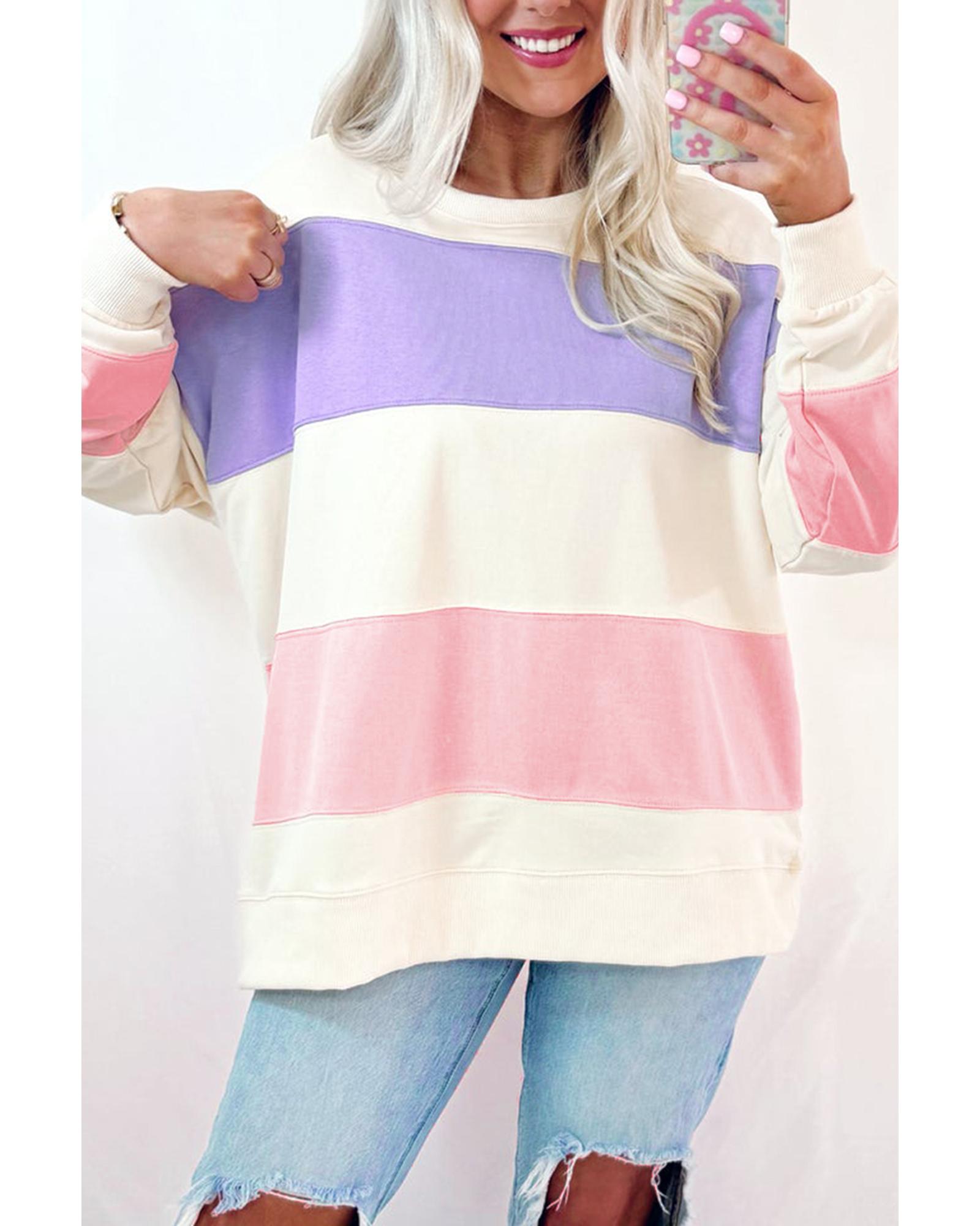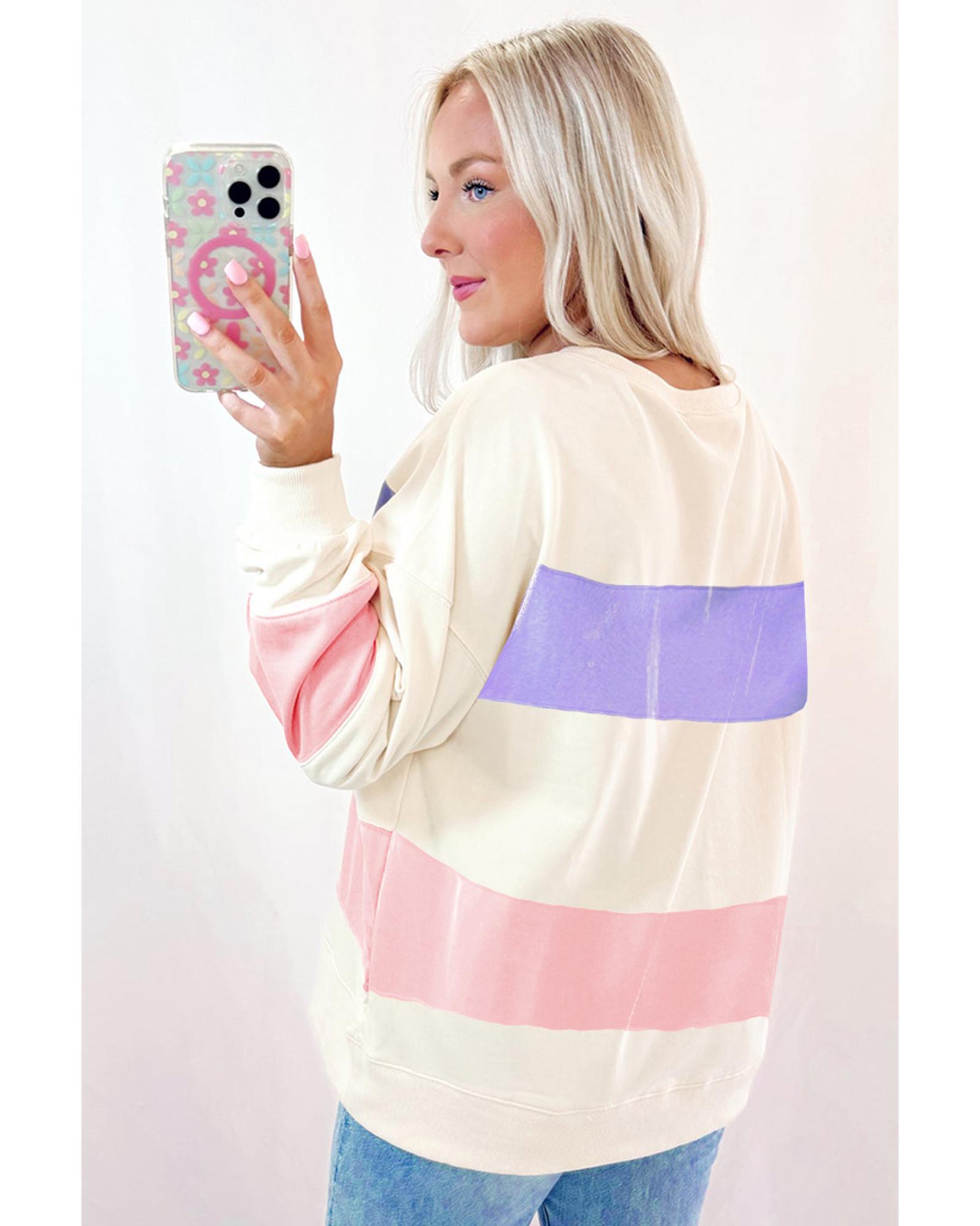Beige Colorblock Patchwork Drop Shoulder Crewneck Sweatshirt – S
