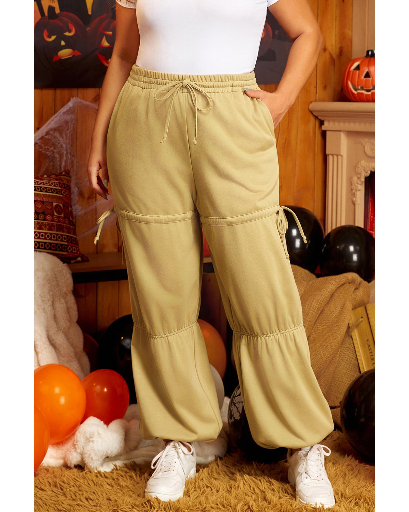 Beige Drawstring Adjusted Band High Waist Plus Size Pants - 3X