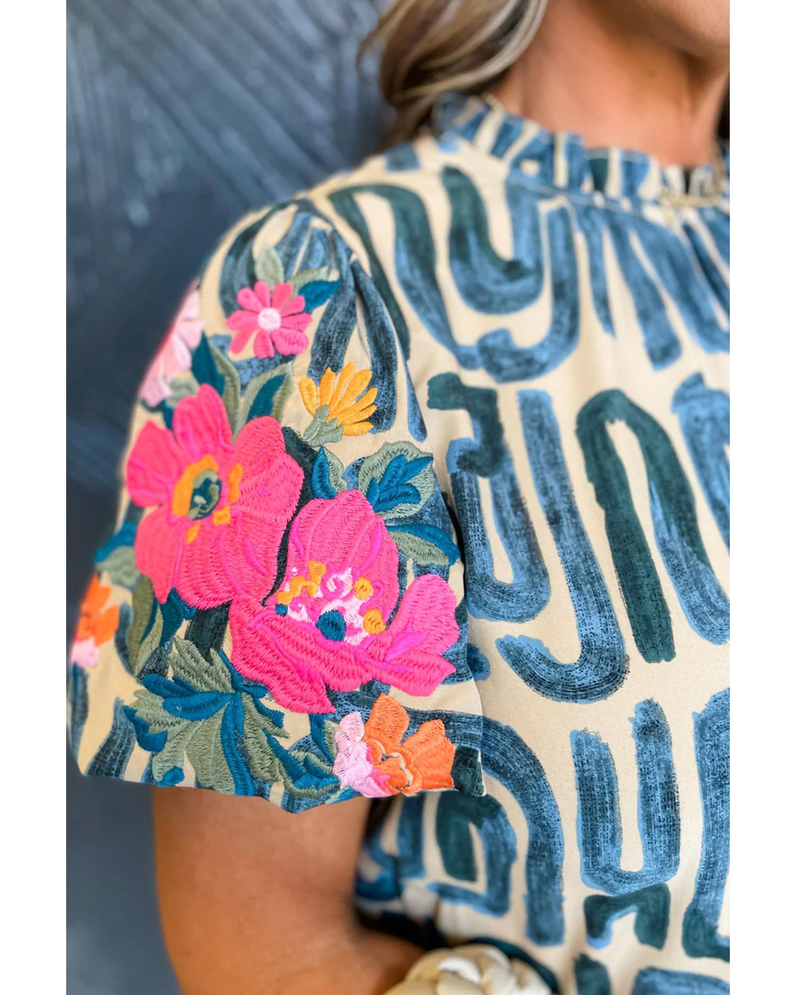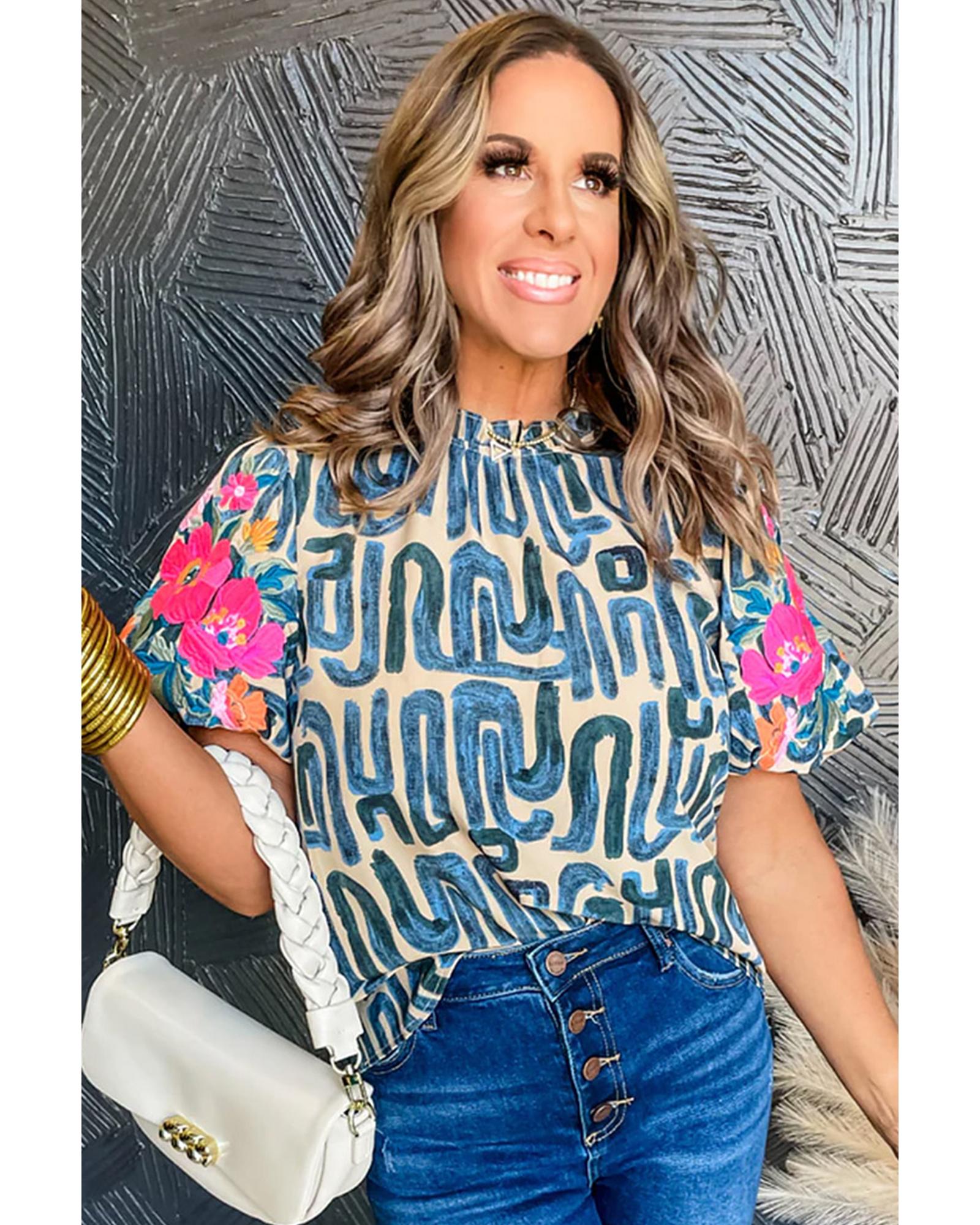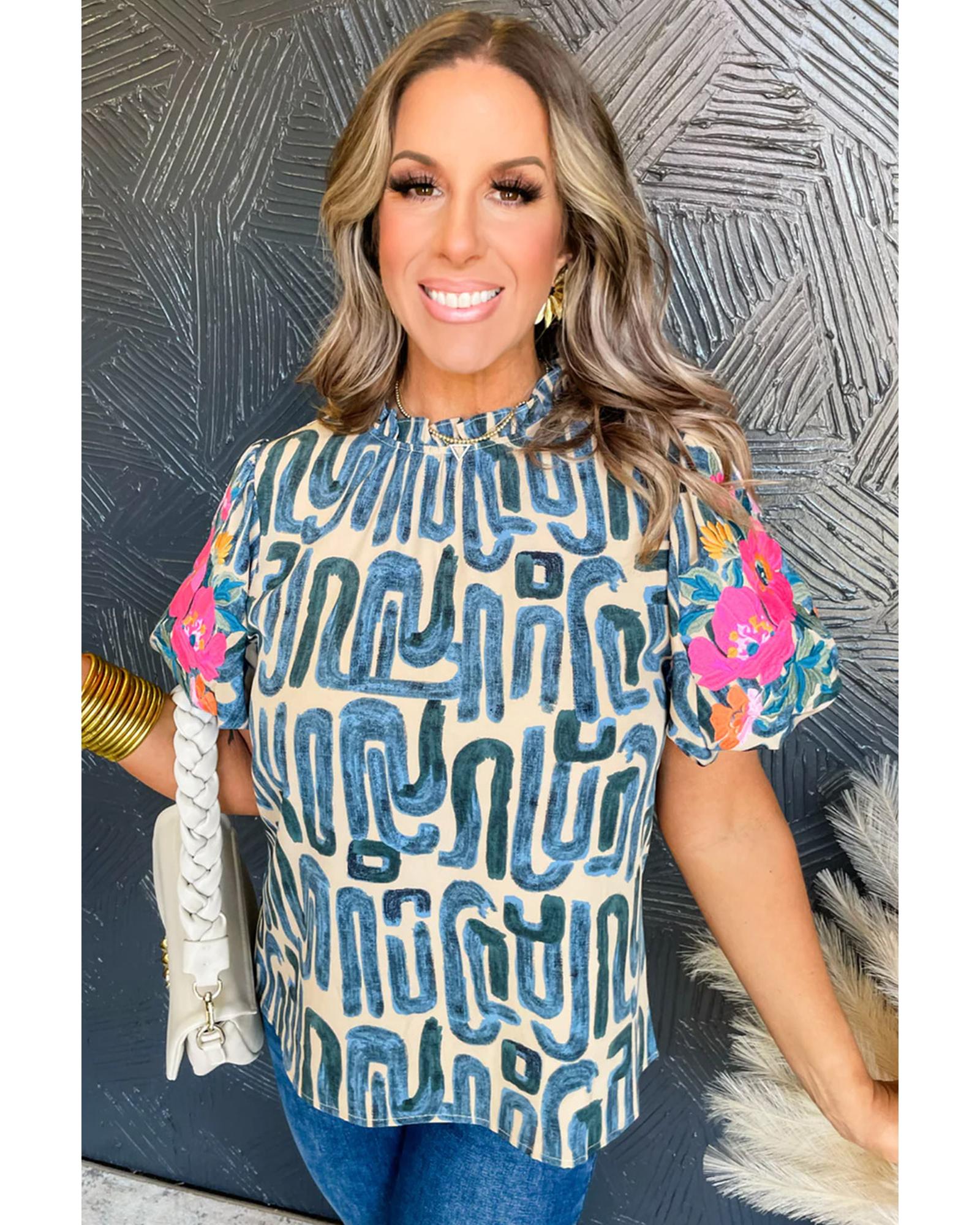 Beige Embroidered Puff Sleeve Frilled Neck Printed Top – M