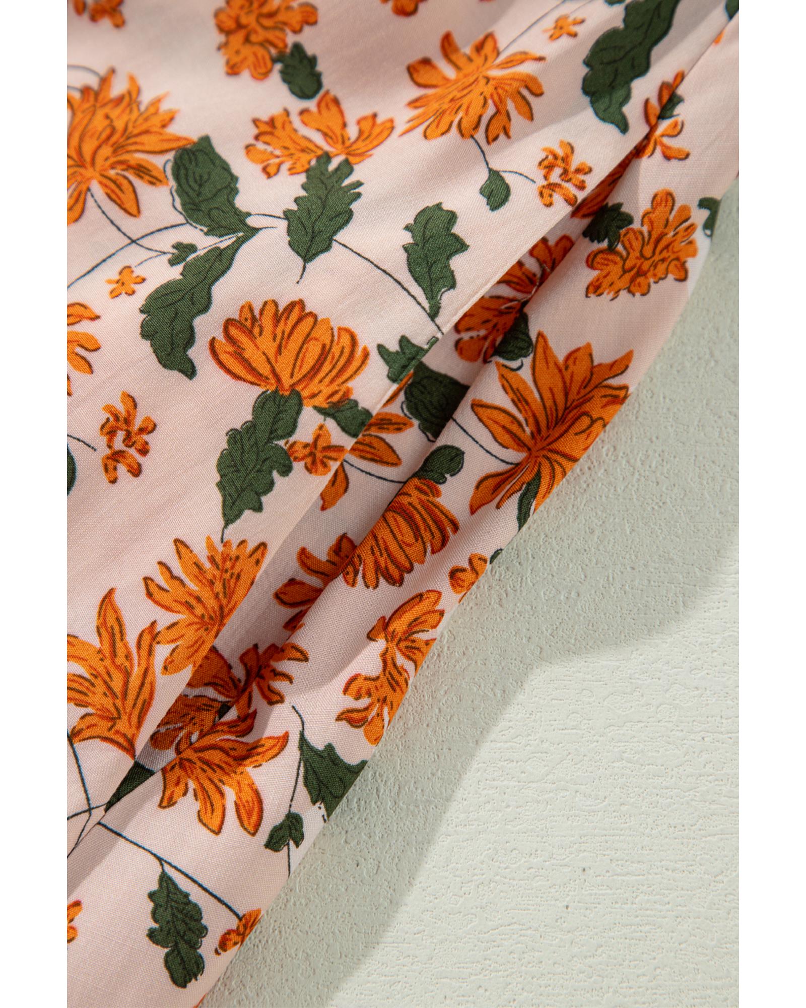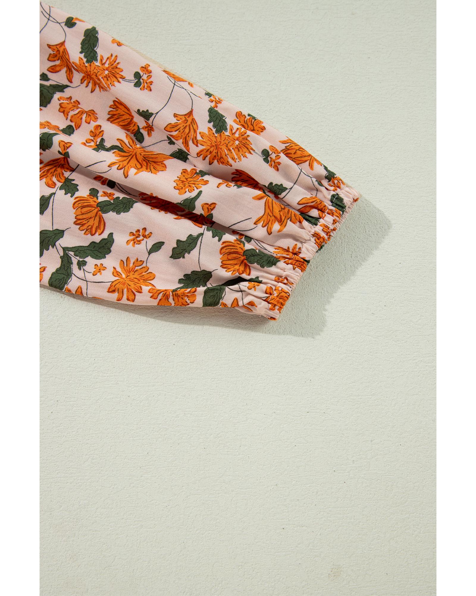 - Beige Floral Deep V Neck Smocked Bust Bubble Sleeve Babydoll Dress