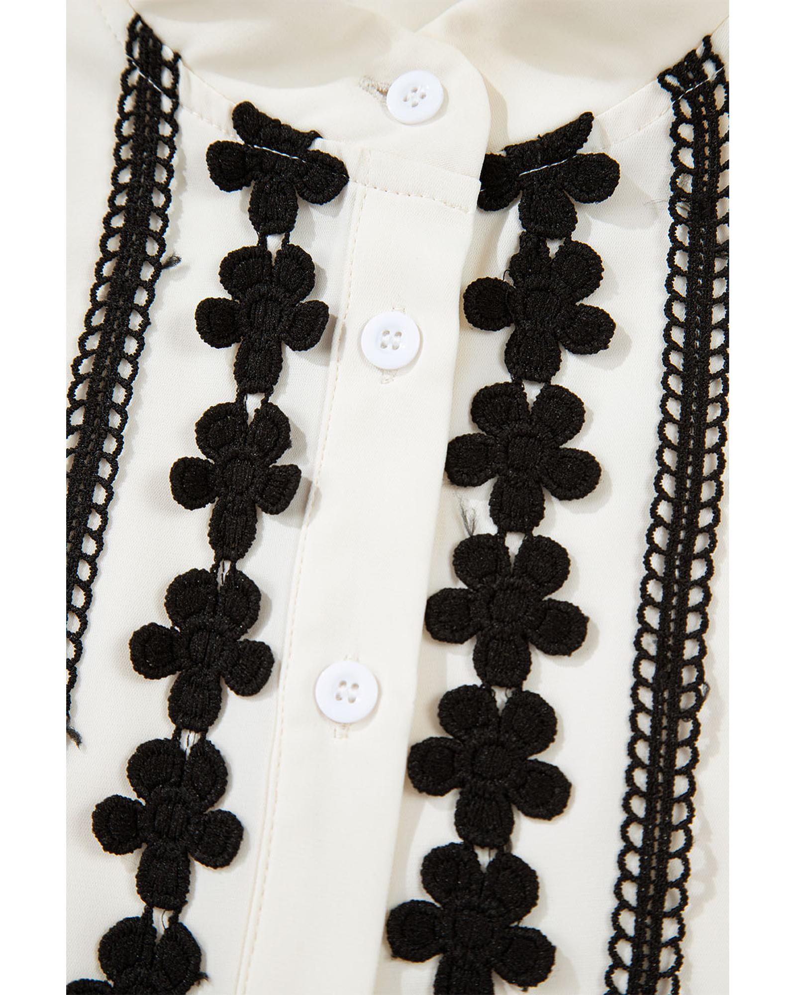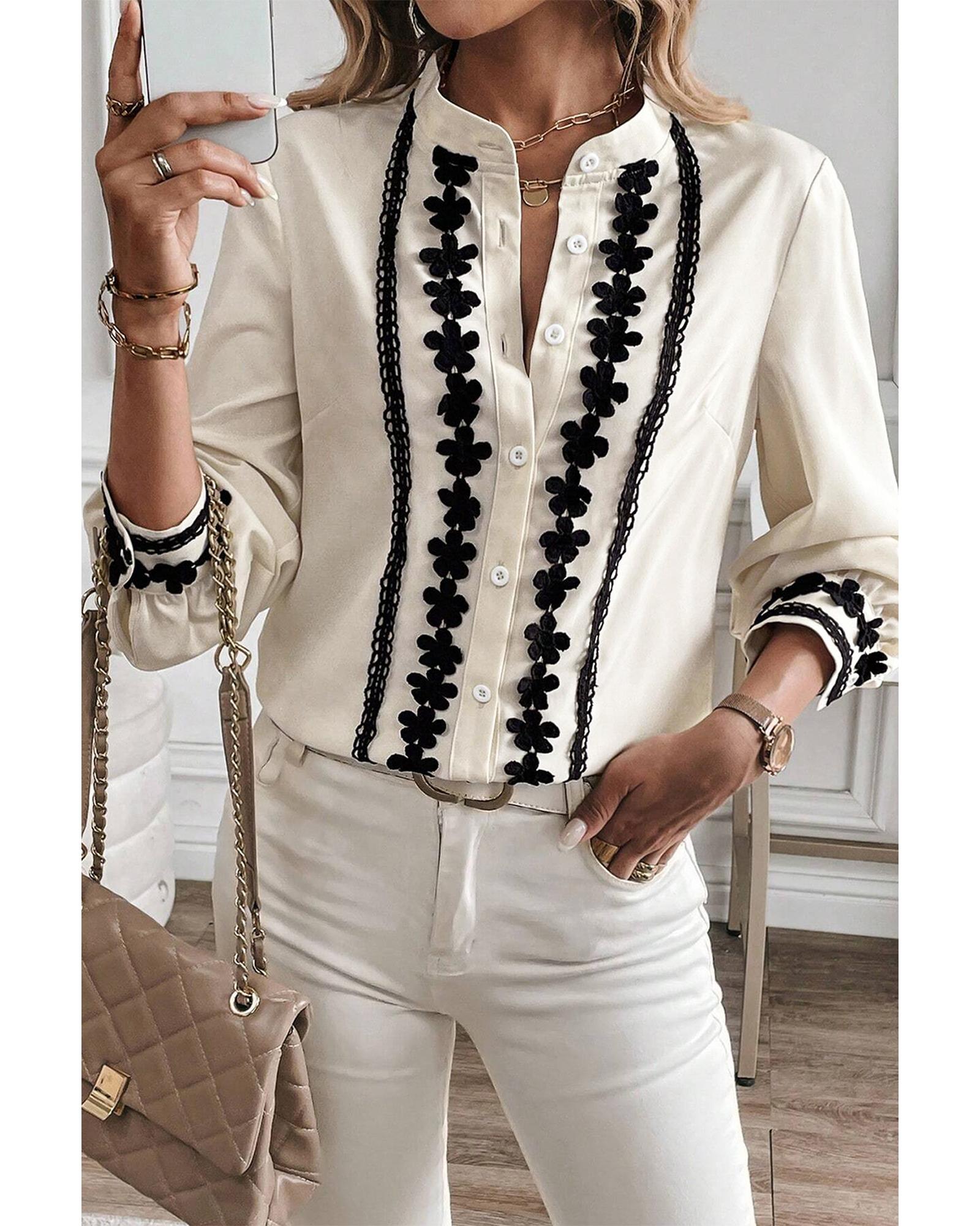 - Beige floral embroidered stand neck buttoned shirt