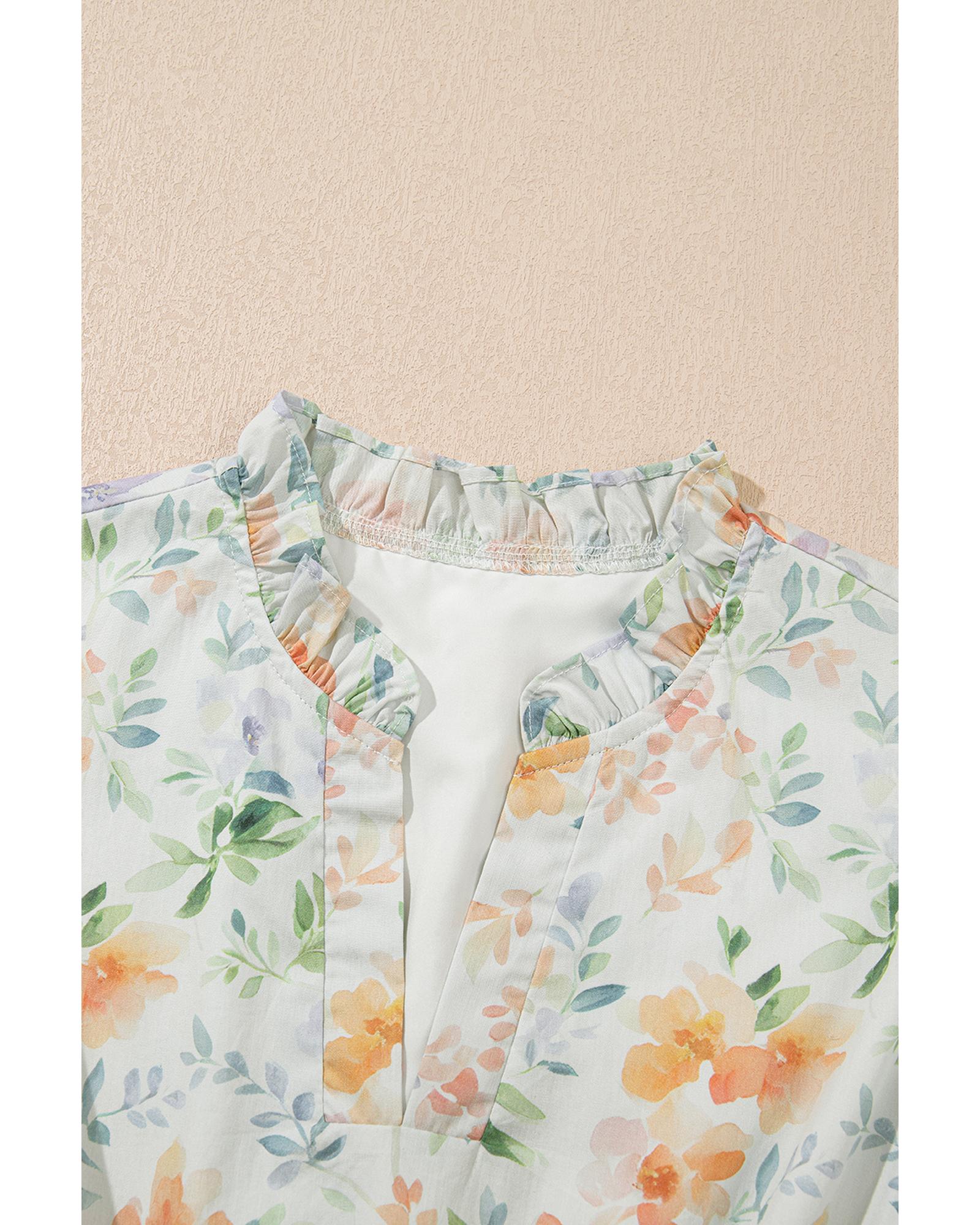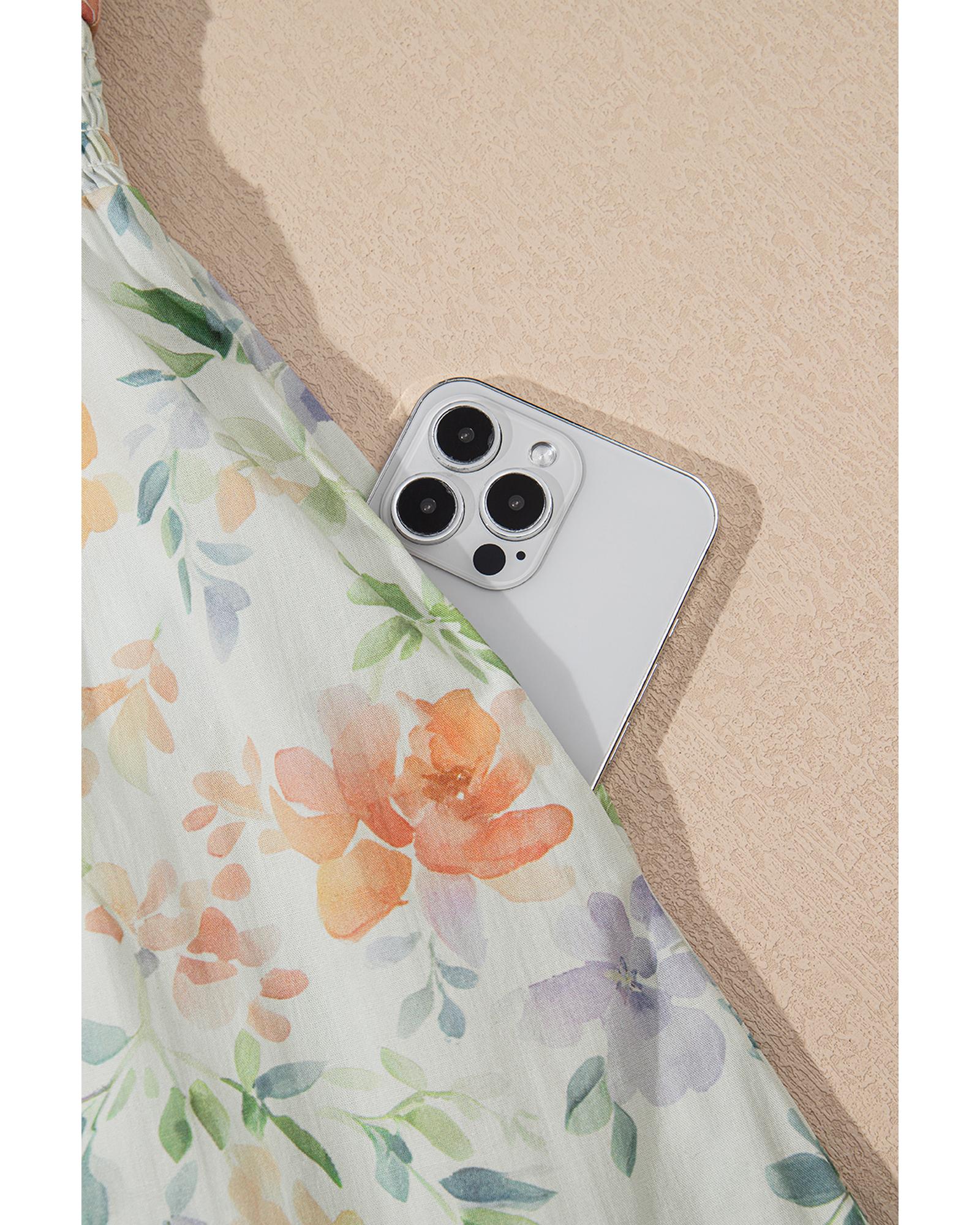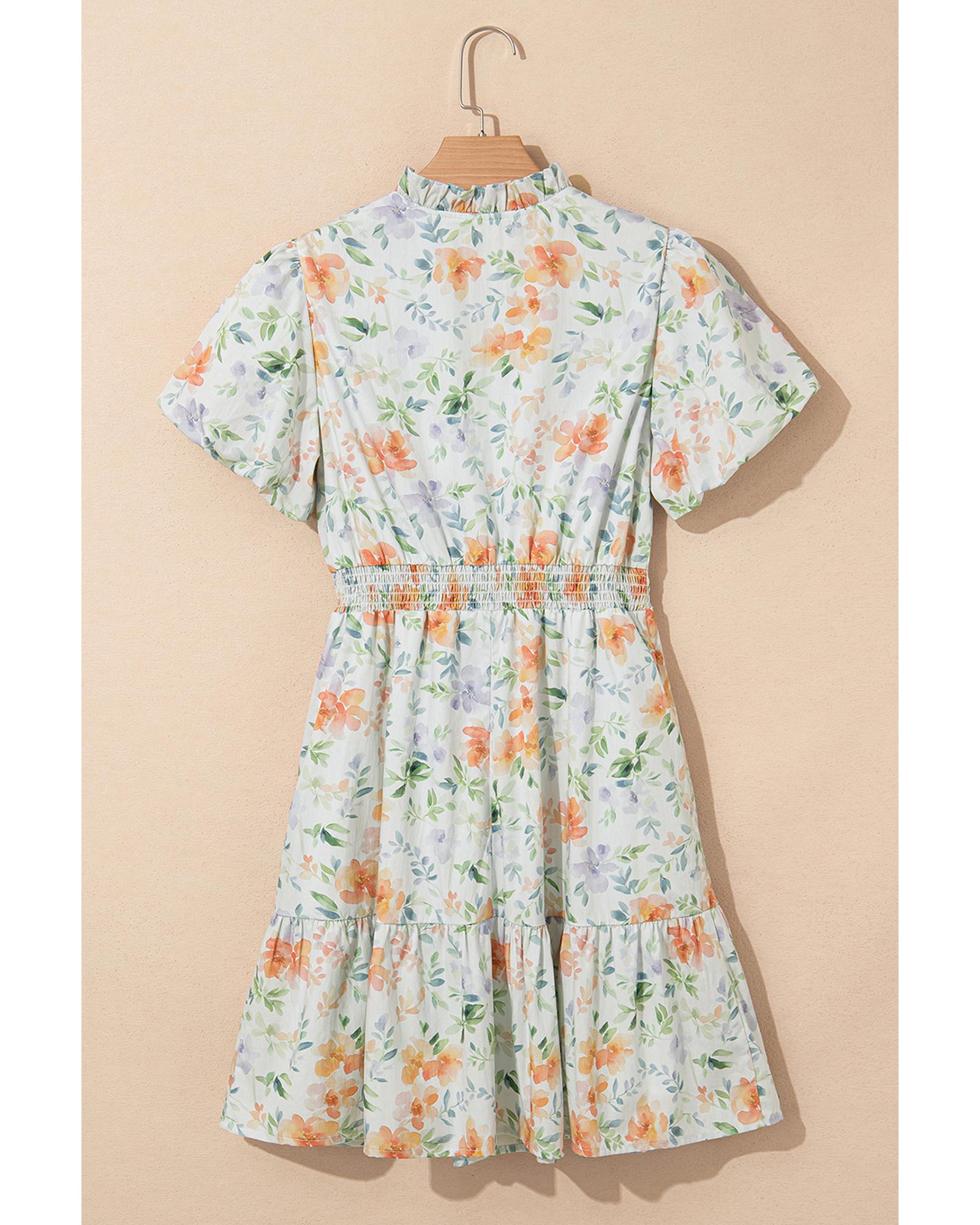 Beige Floral Print Shirred High Waist Puff Sleeve Mini Dress – S