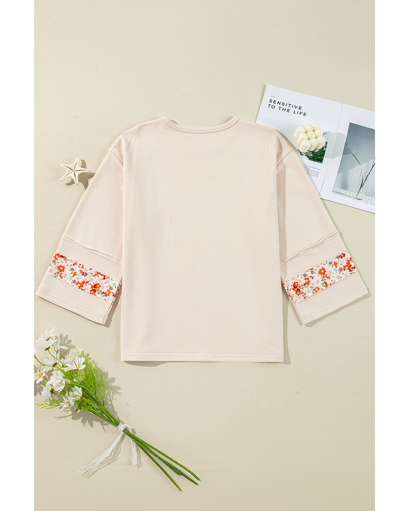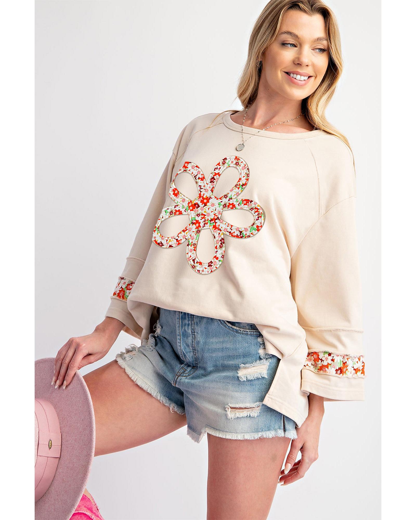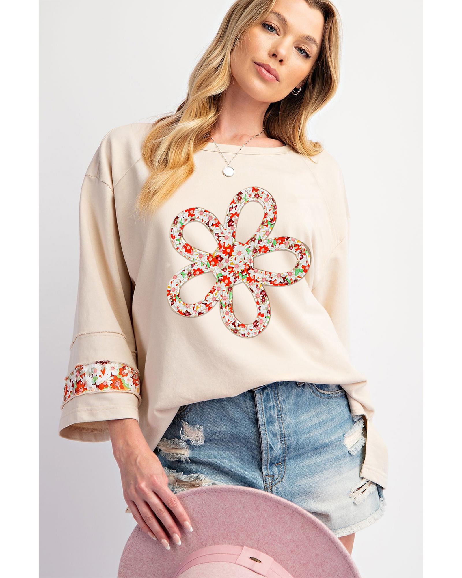 Beige Flower Patch Graphic Exposed Seam Wide Sleeve Top – M
