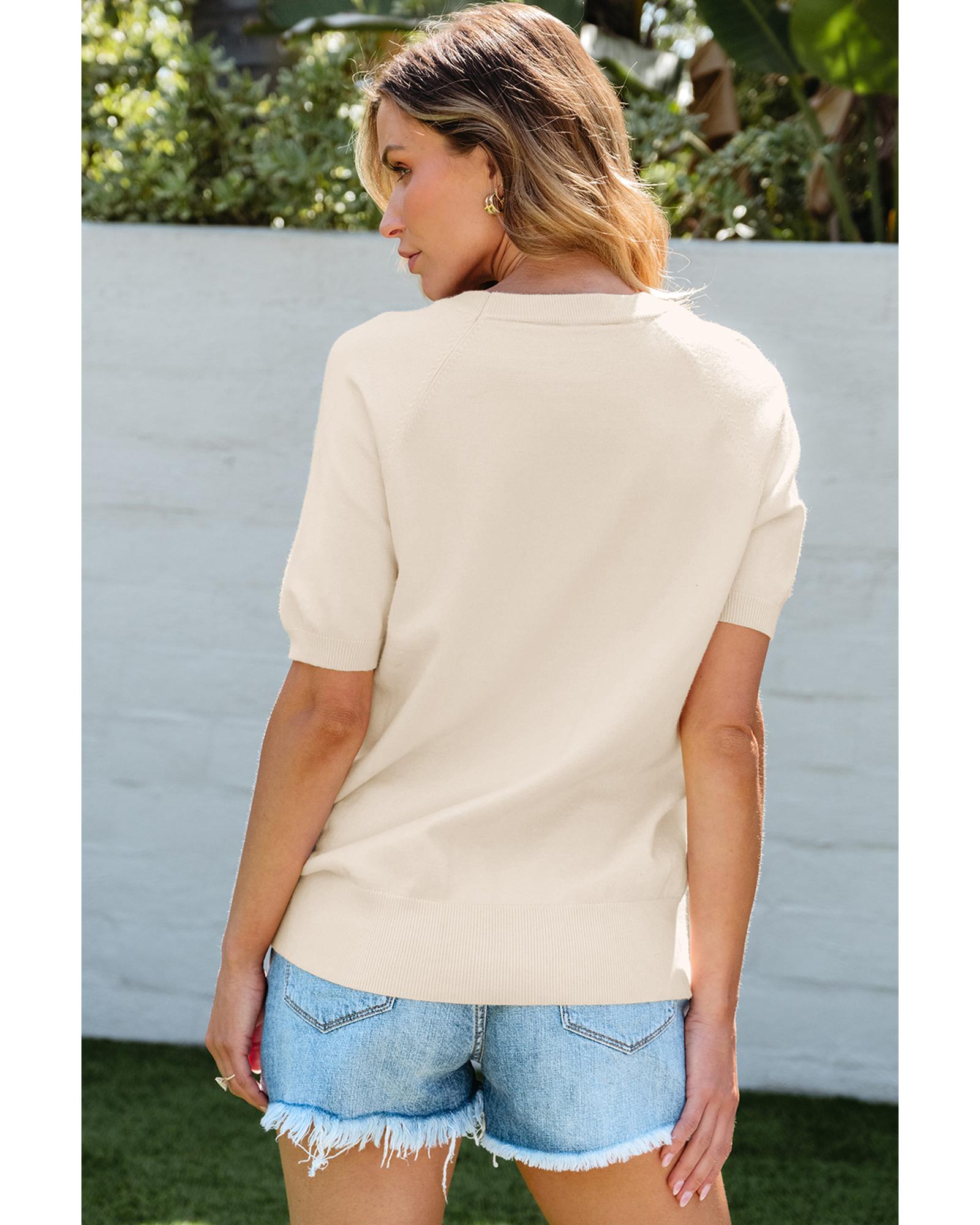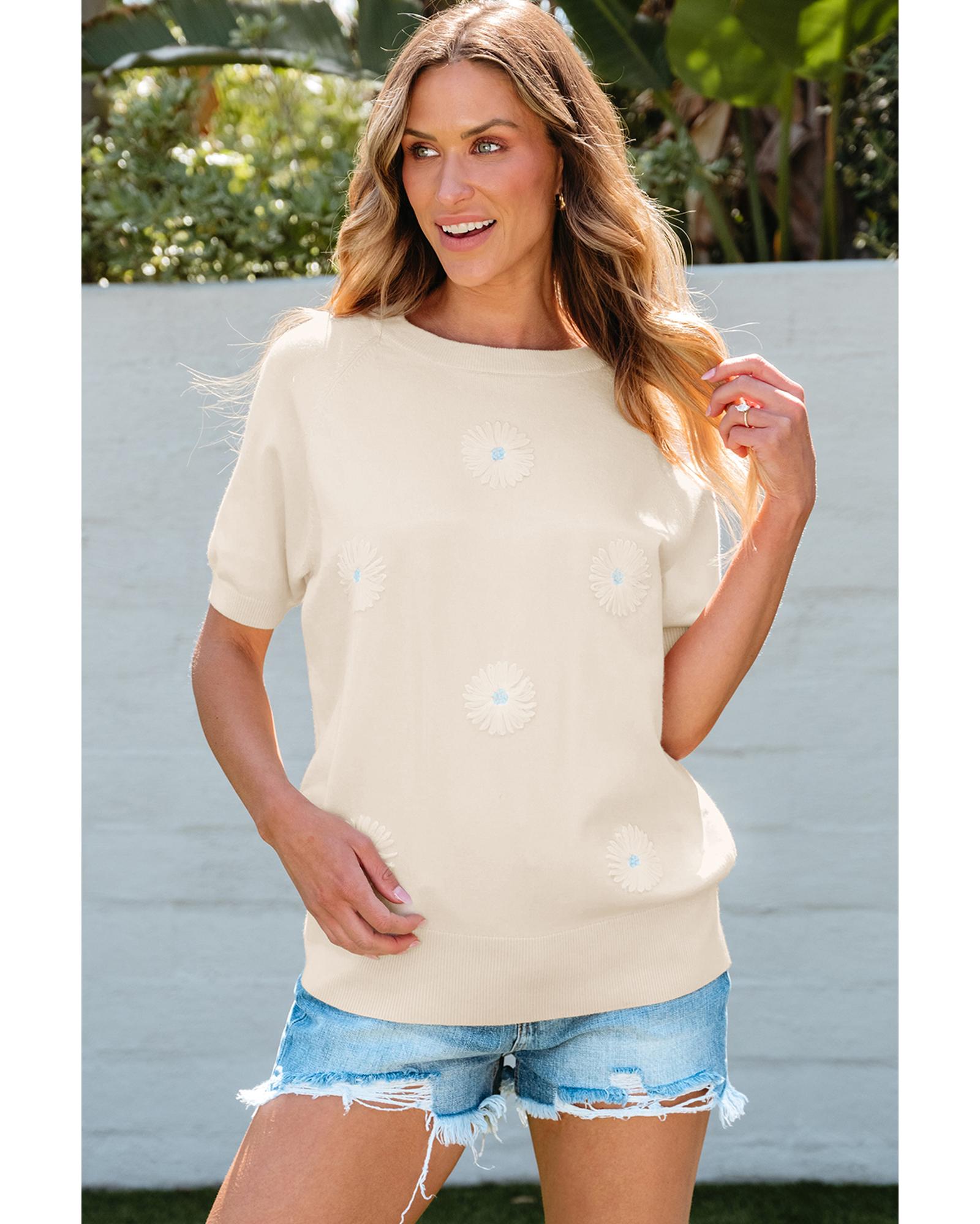 - Beige flower pattern short sleeve knitted top