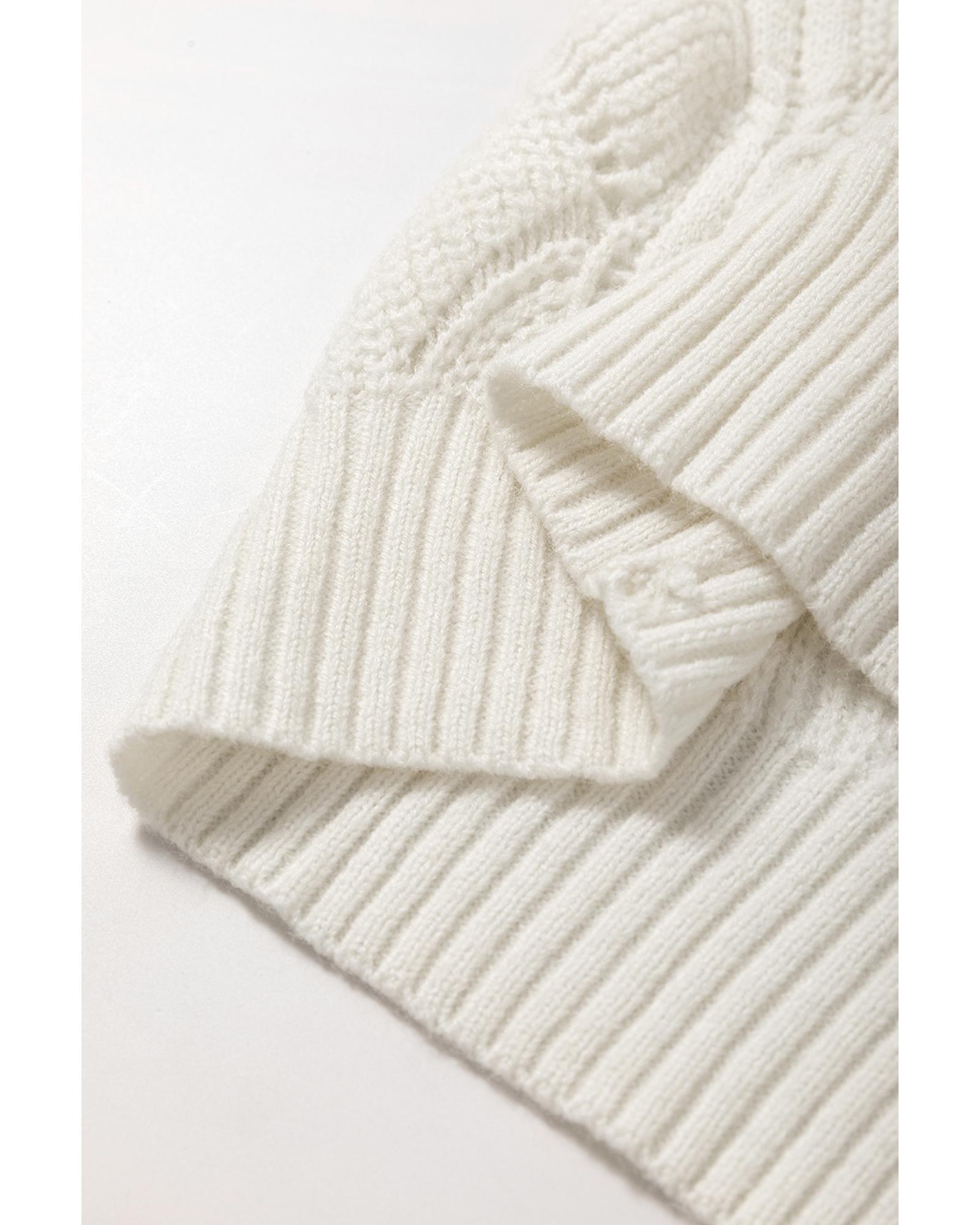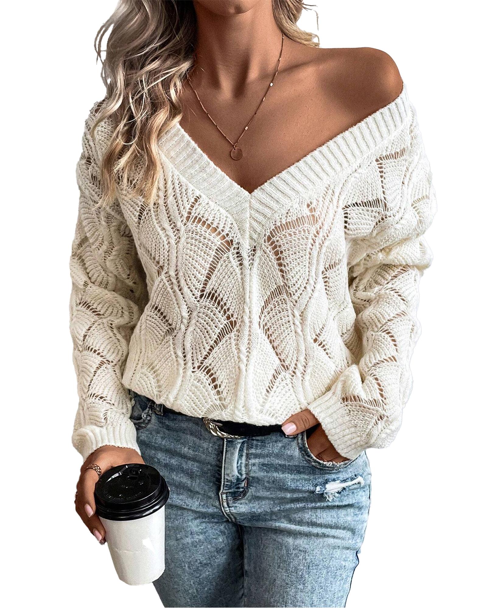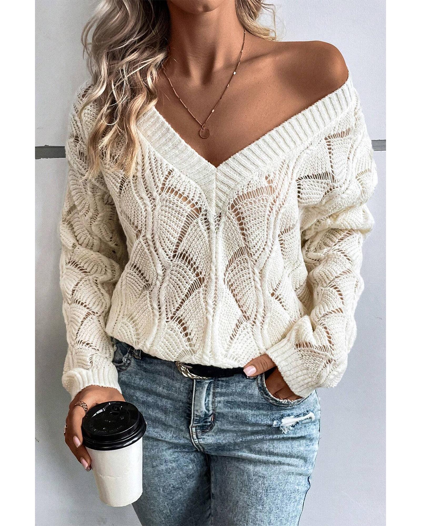 Beige Hollow Out Knit V Neck Drop Shoulder Sweater – L