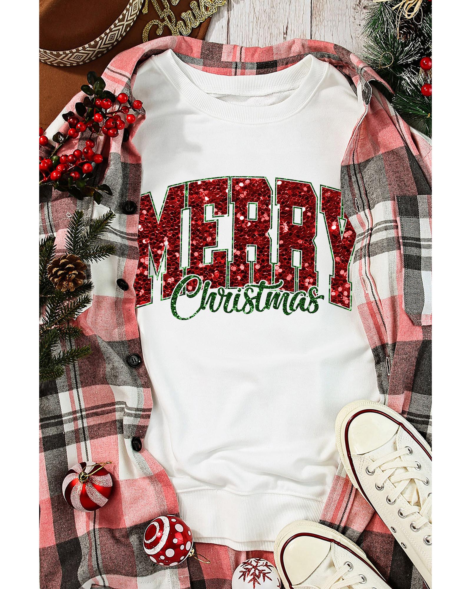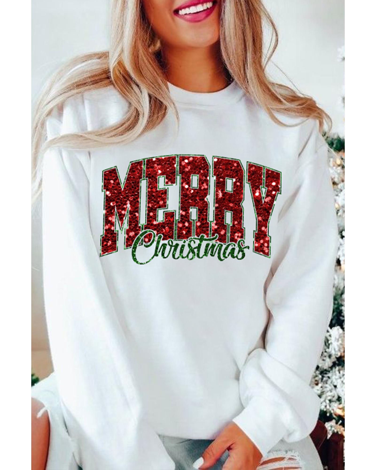 Beige MERRY Christmas Heat Transfer Printing Crewneck Pullover Sweatshirt – L