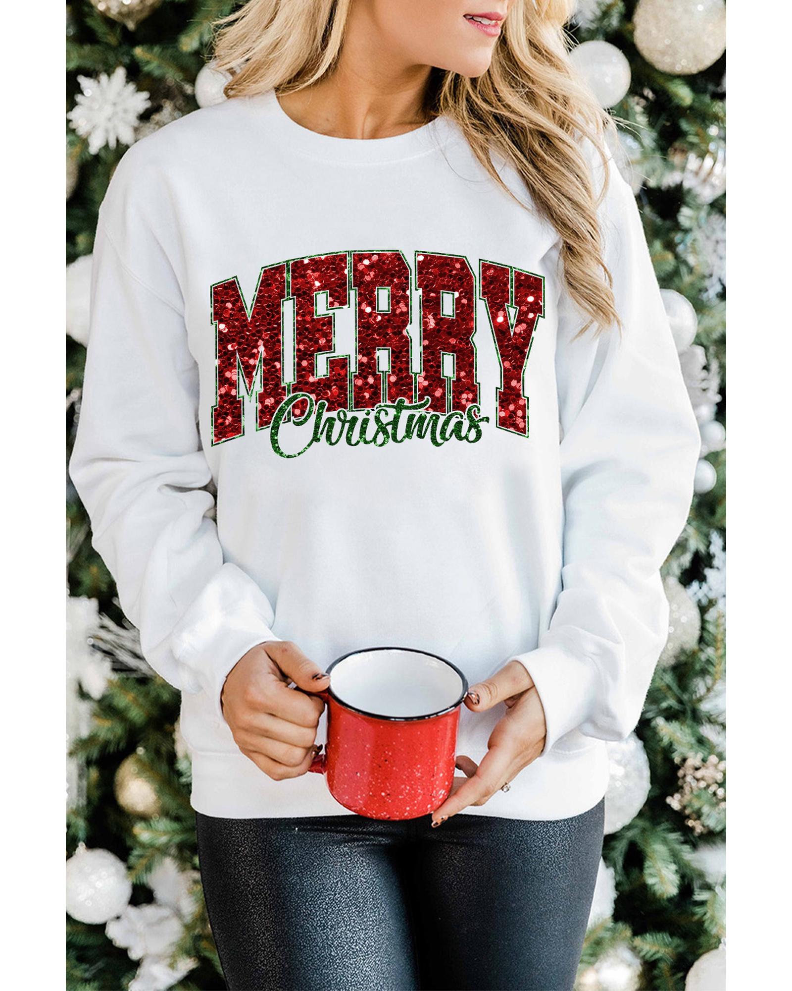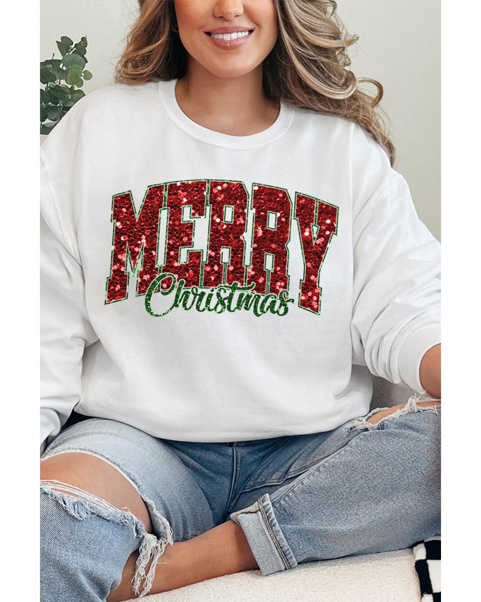 Beige MERRY Christmas Heat Transfer Printing Crewneck Pullover Sweatshirt – S