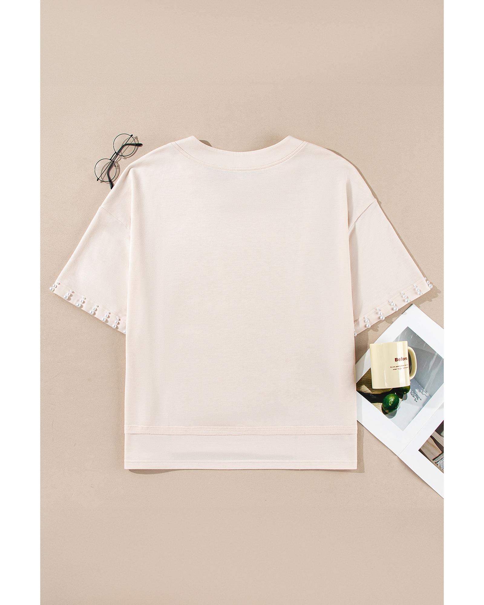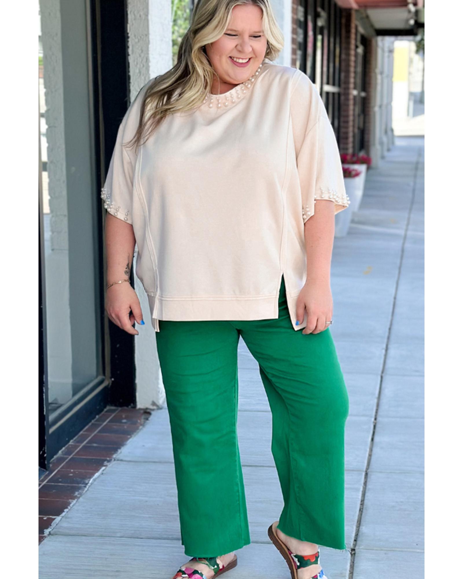 Beige Pearl Decor Crew Neck Half Sleeve Plus Size T Shirt – 2X