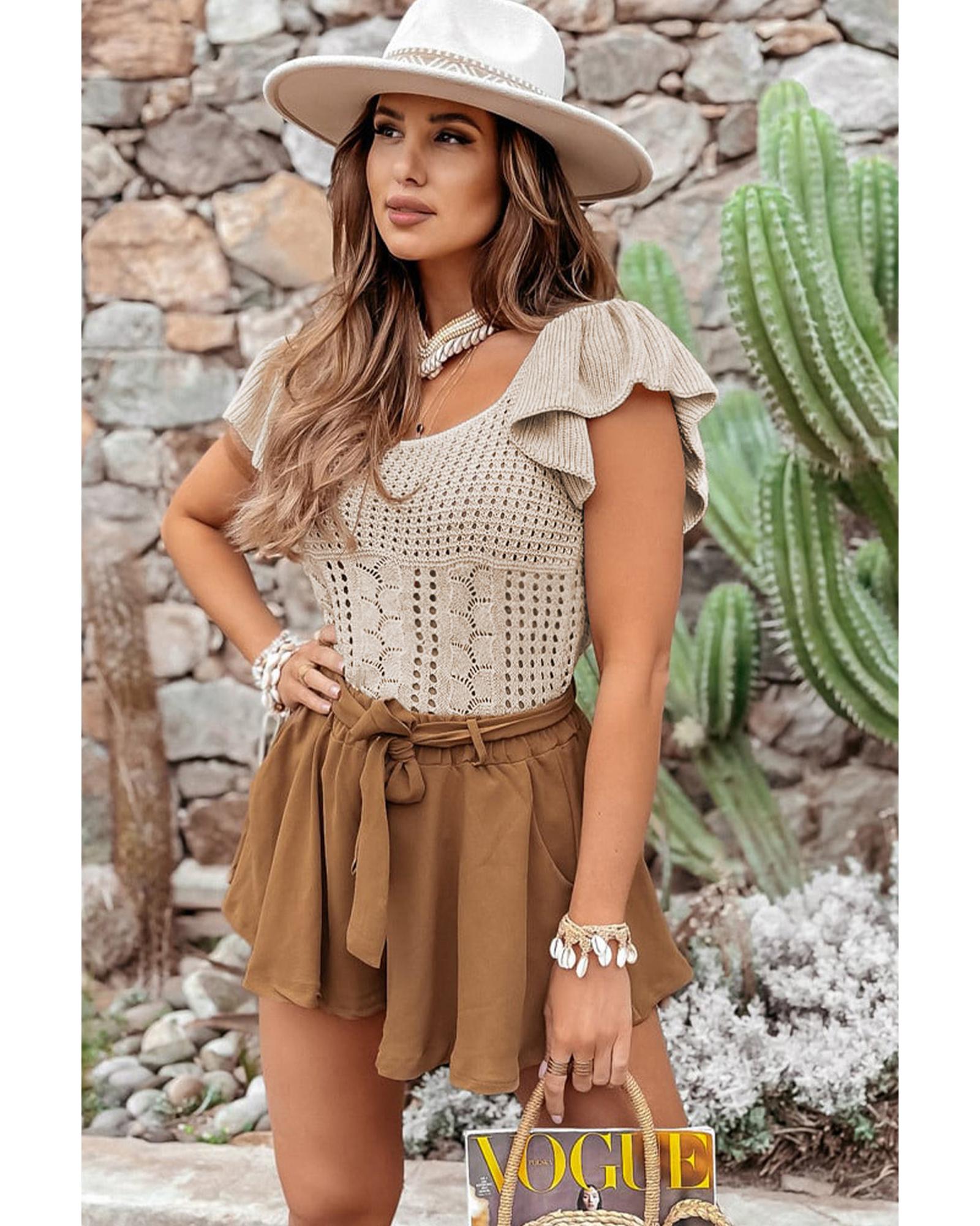 - Versatile and feminine Beige Pointelle Knit Flutter Sleeve Sweater