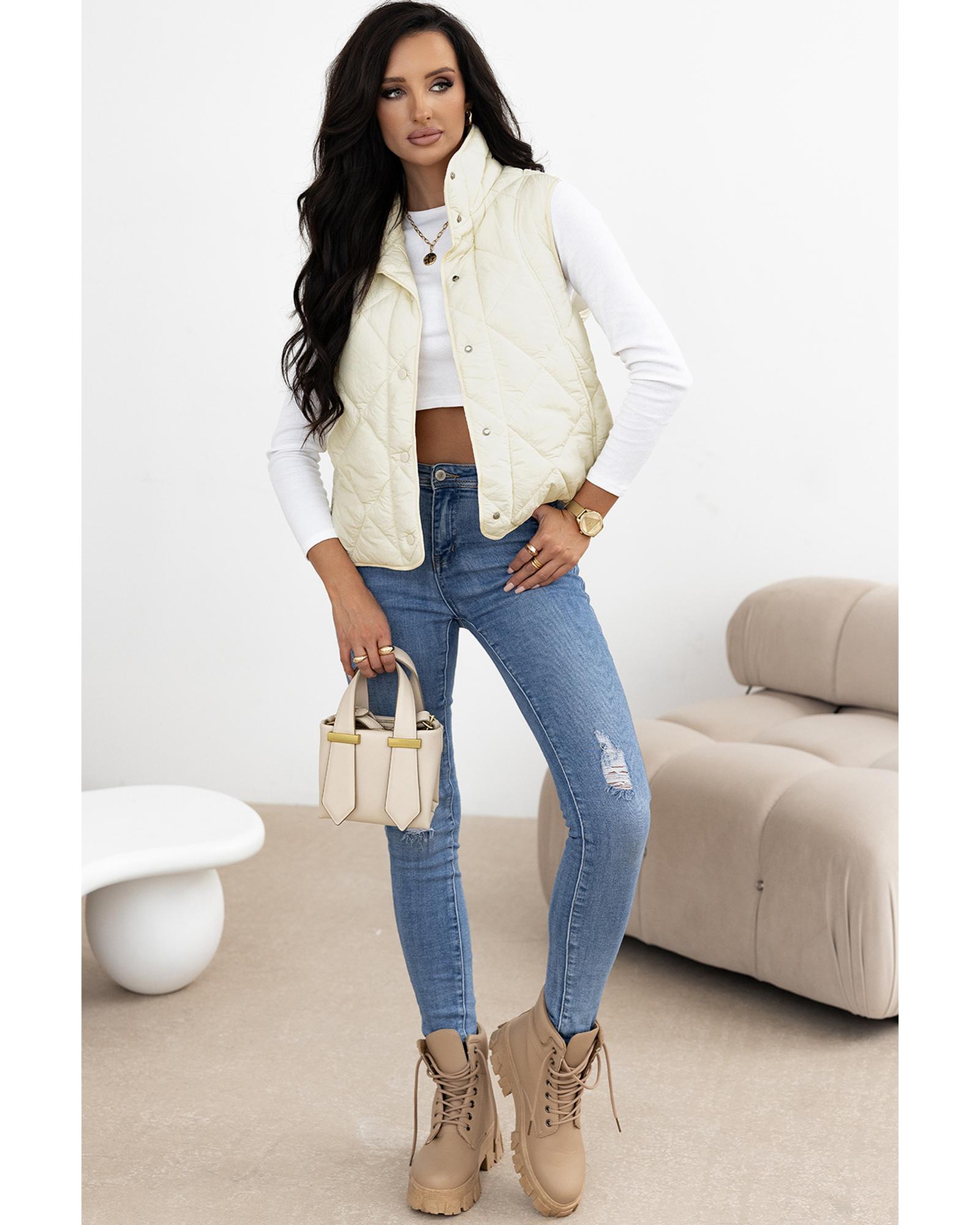 - Beige quilted high neck button up pocket vest coat