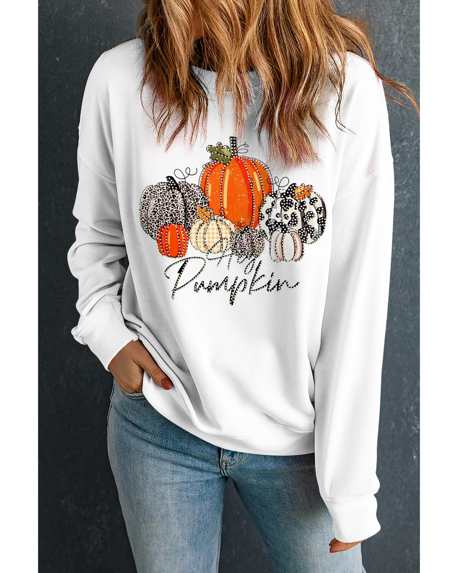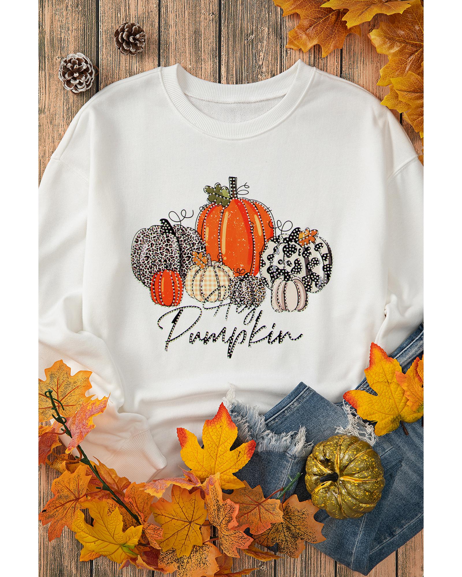 Beige Rhinestone Pumpkin Graphic Crewneck Thanksgiving Sweatshirt – M