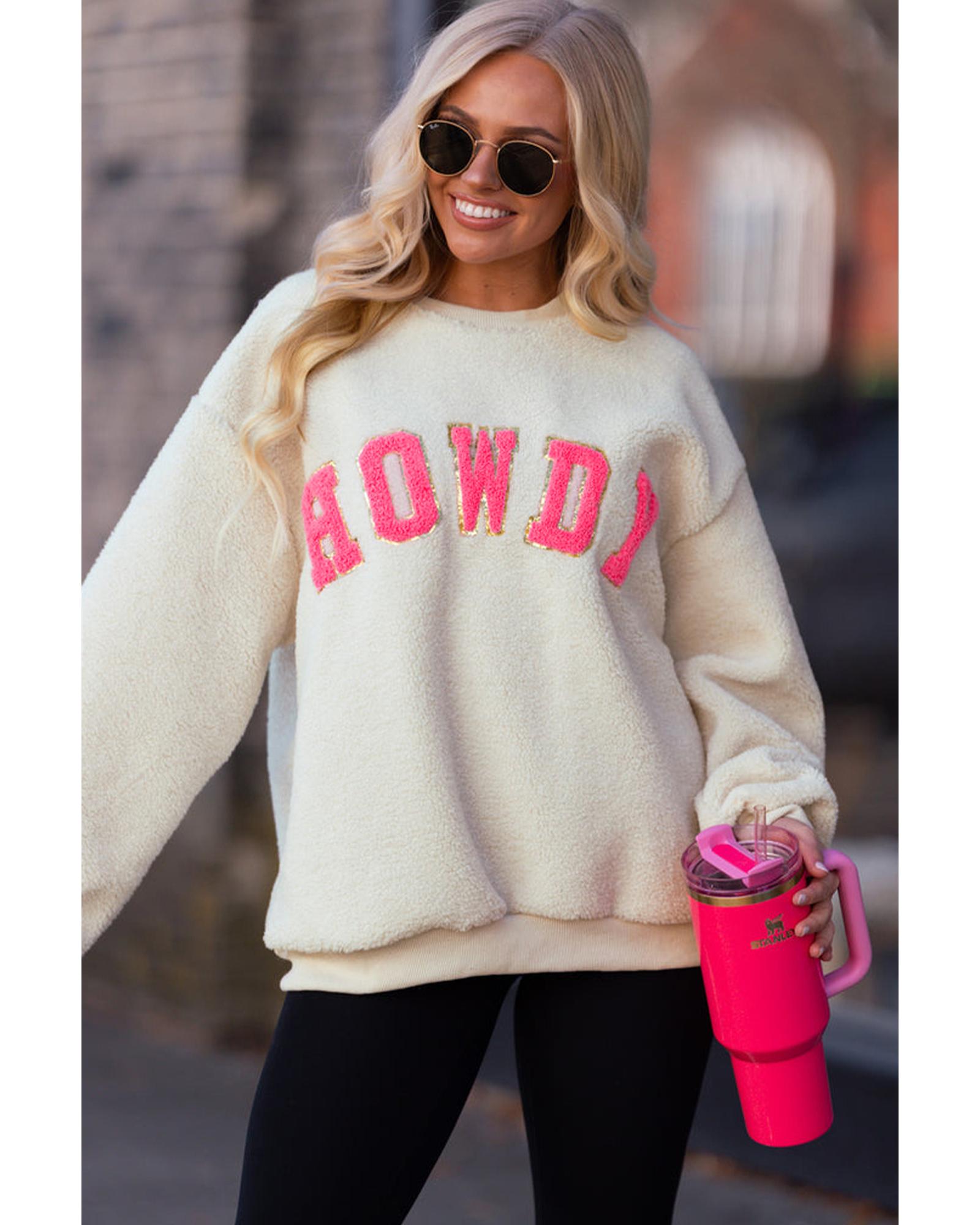 - Beige Sherpa HOWDY Patched Pullover Sweatshirt