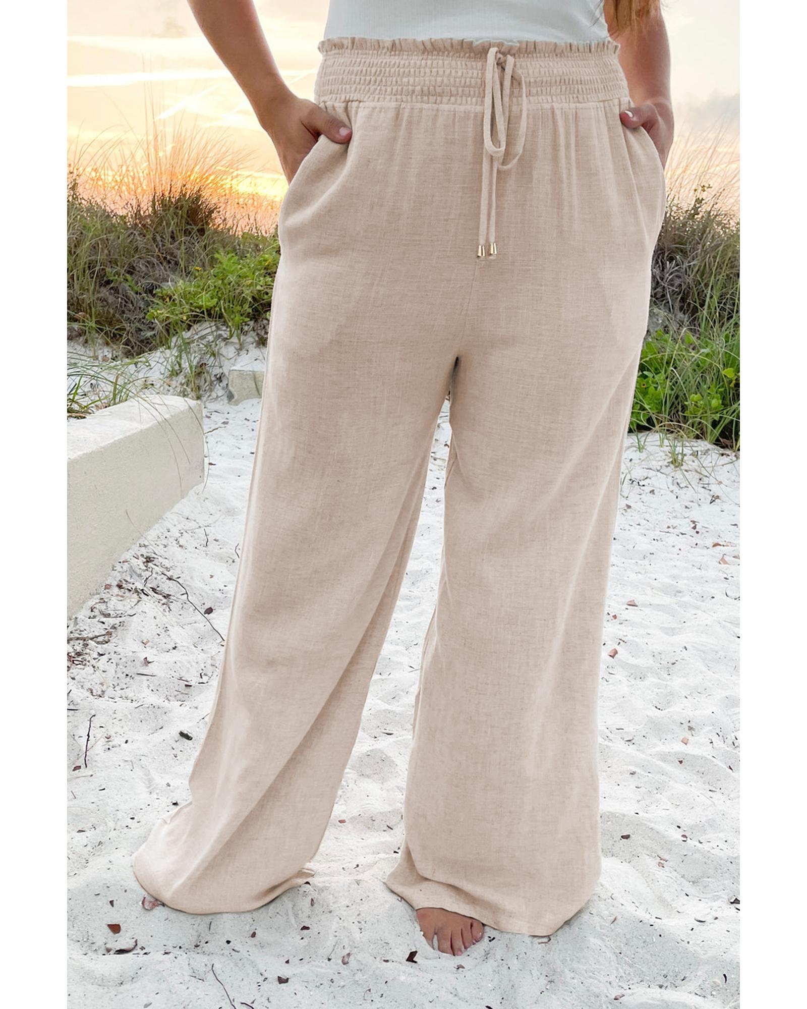 Beige Smocked High Waist Wide Leg Plus Size Pants – 2X