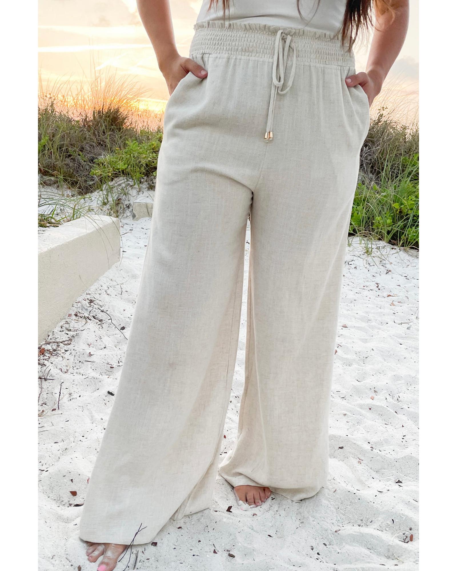 Beige Smocked High Waist Wide Leg Plus Size Pants – 3X