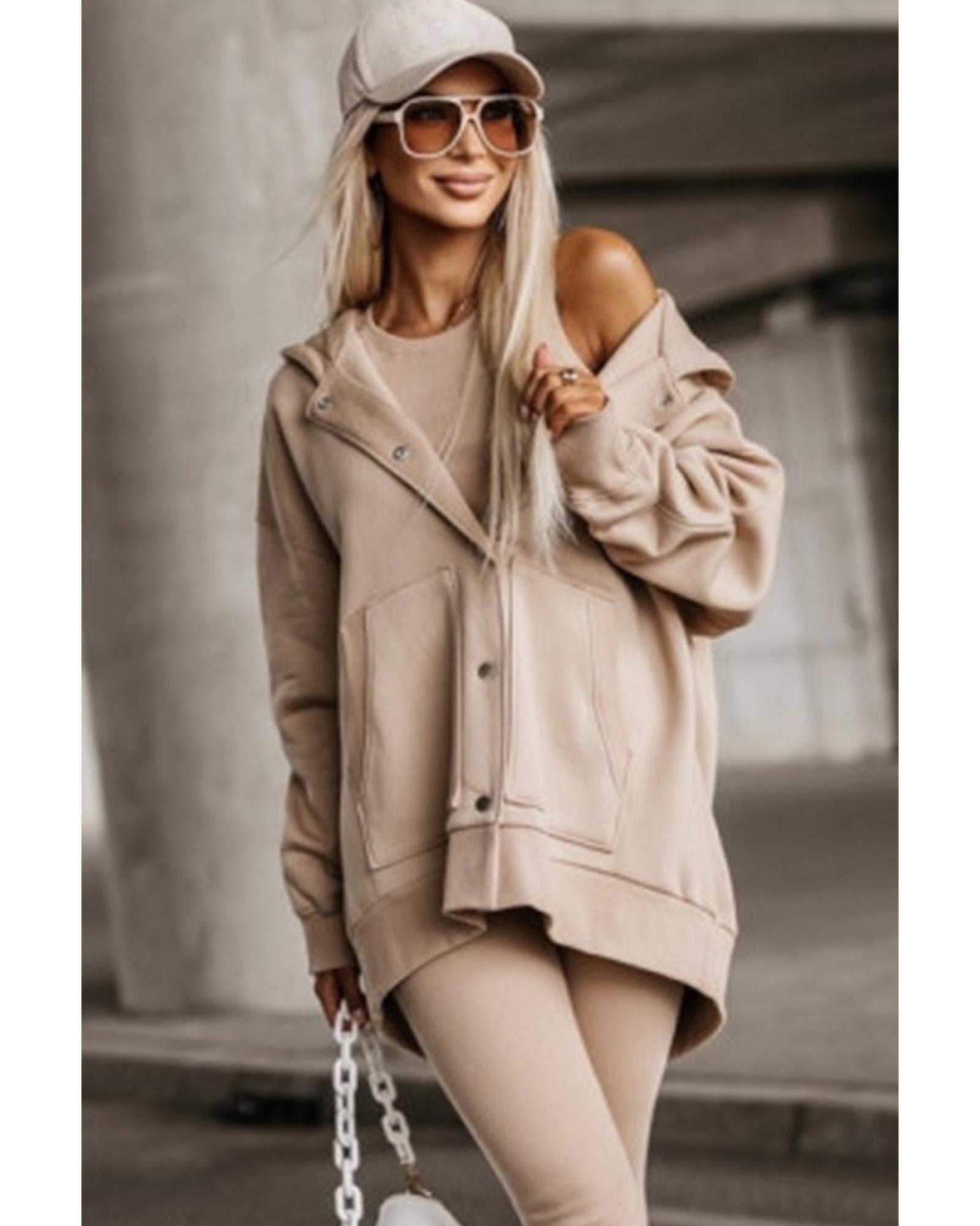 Beige Solid Color Pocketed Button Up Loose Hoodie – L