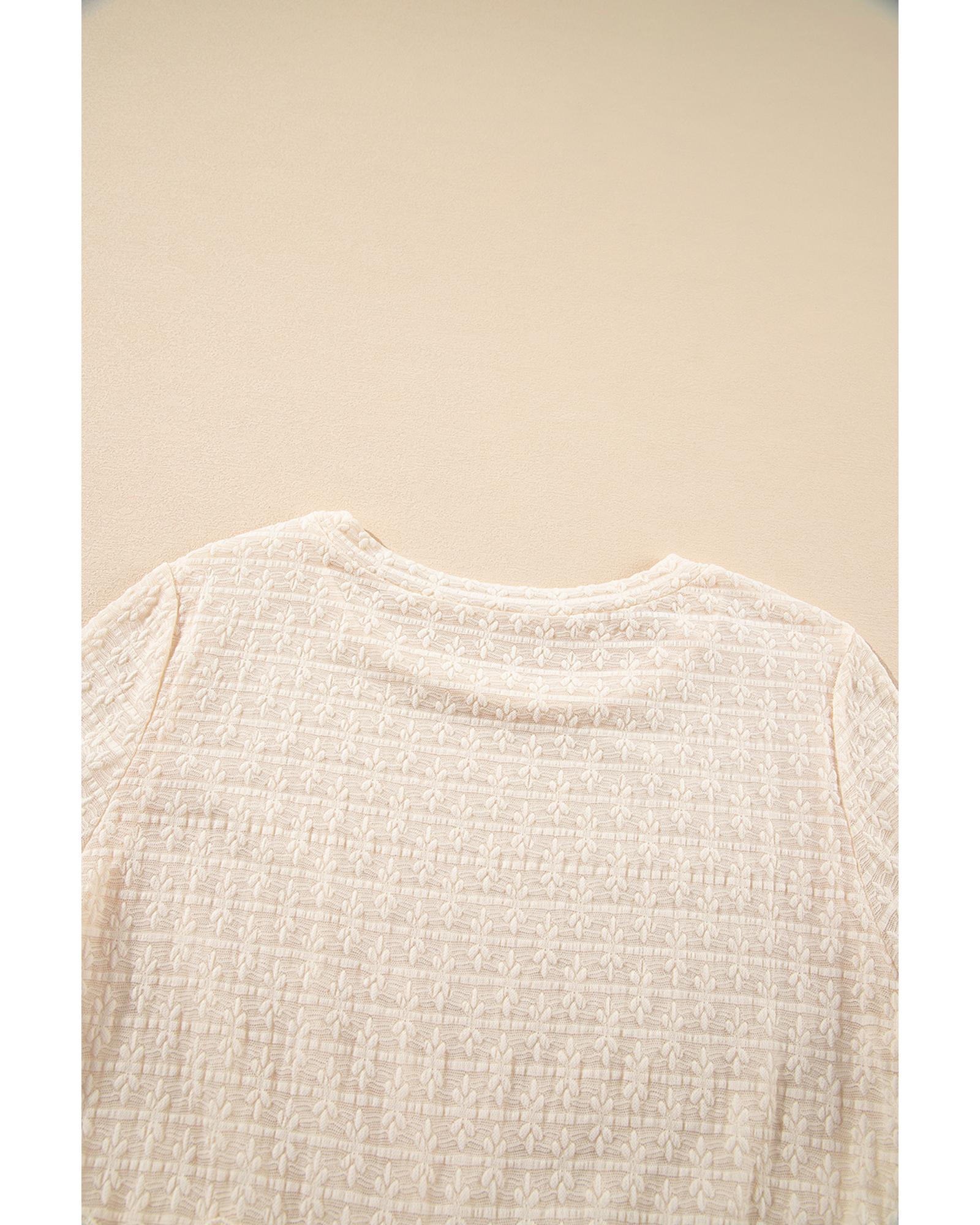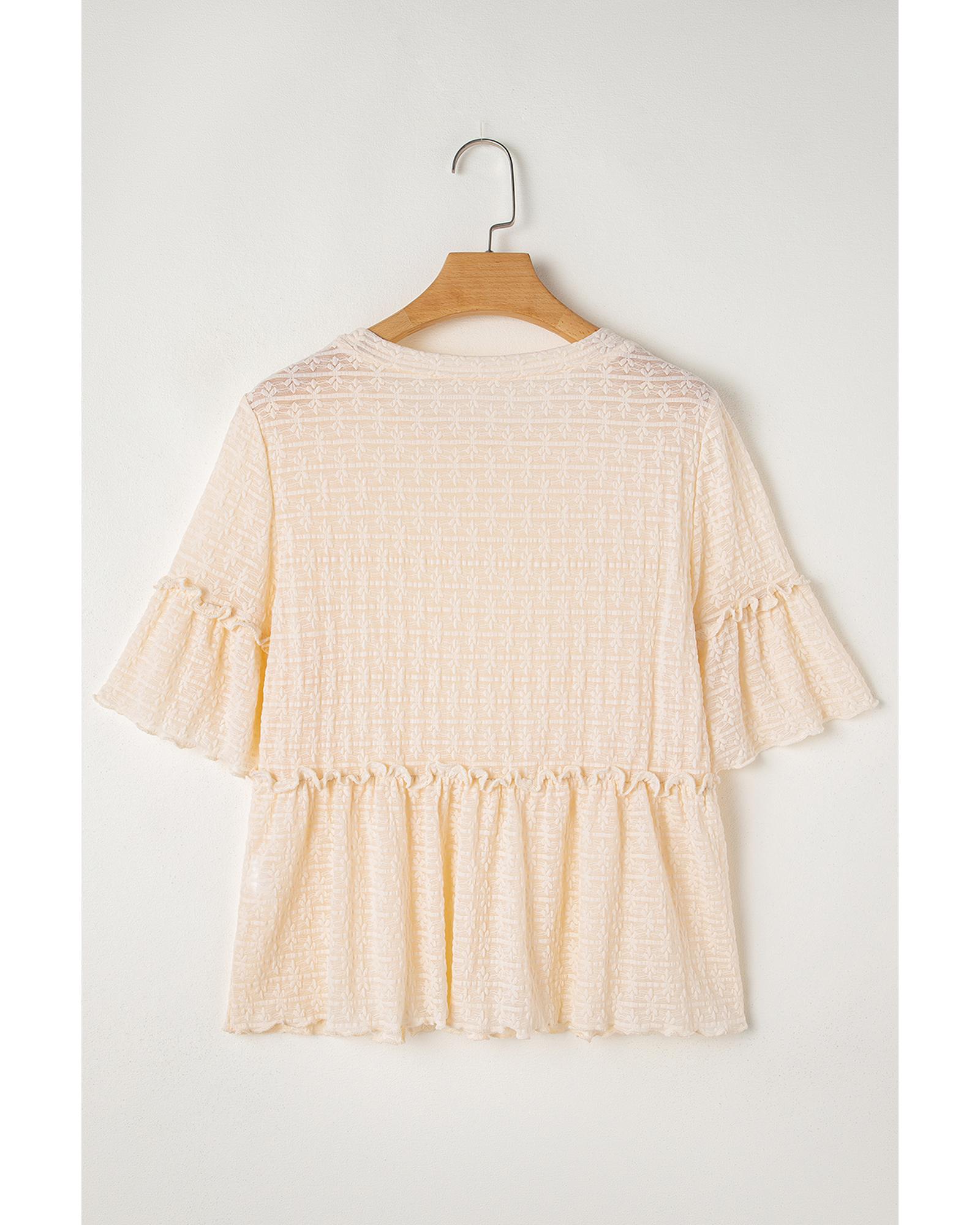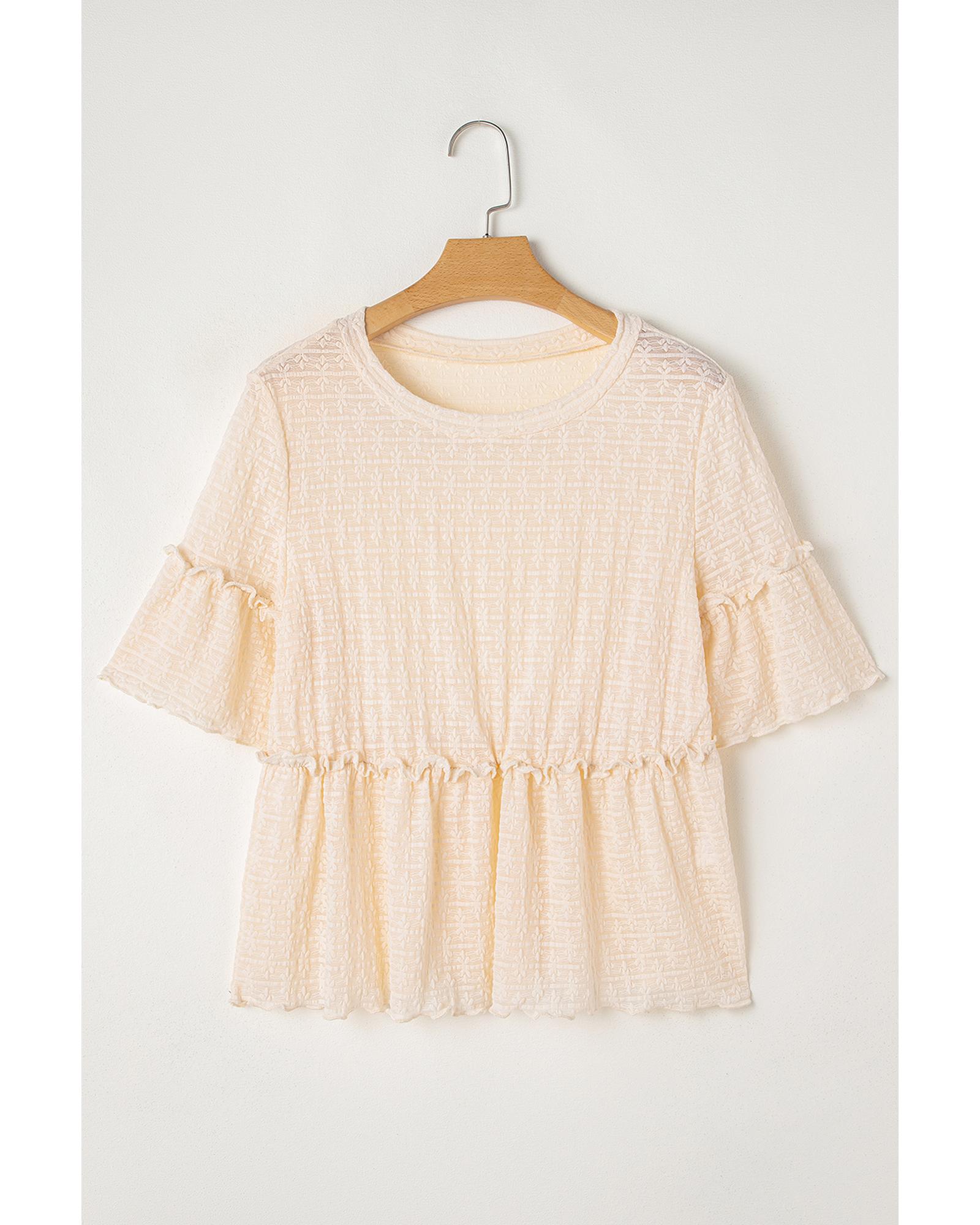 Beige Solid Color Textured Ruffled Short Sleeve Blouse – M