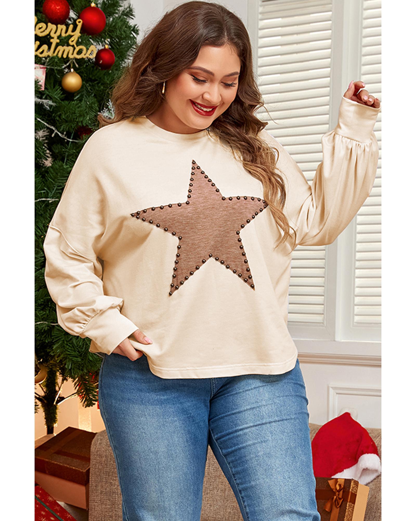 Beige Star Shape Studded Crew Neck Plus Size T Shirt – 1X