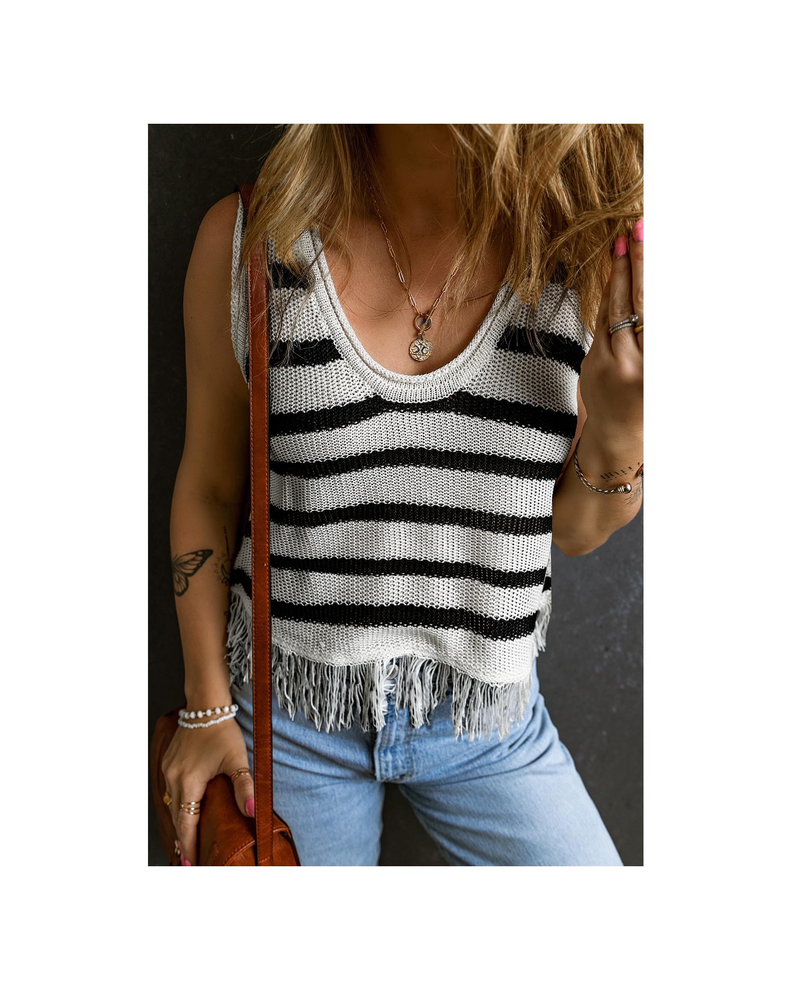 Beige Stripe Loose Knit Fringe Tank Top – L