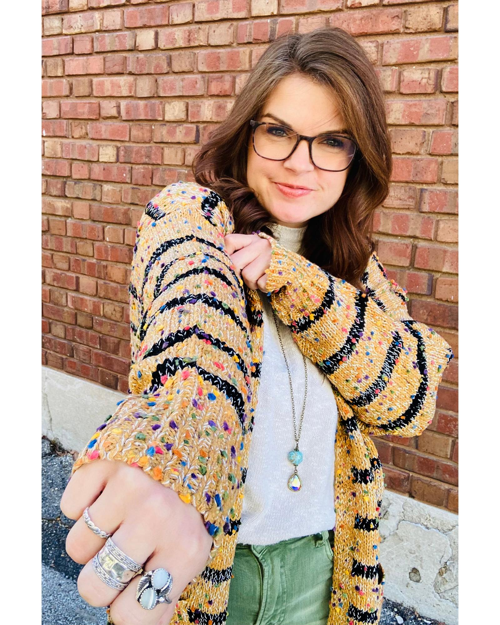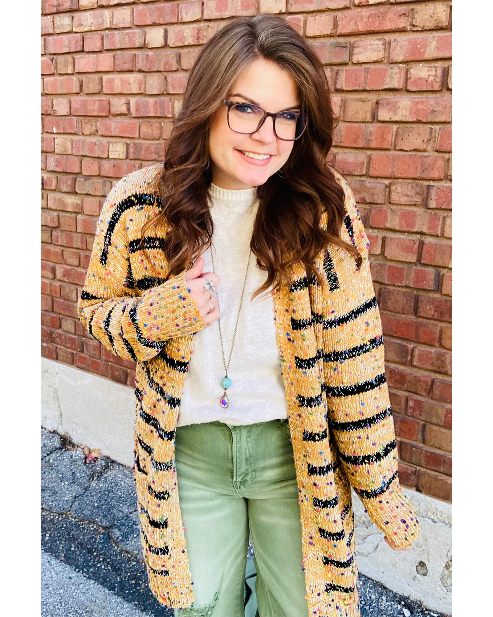 Beige Striped Pom Pom Knit Open Front Long Cardigan – L