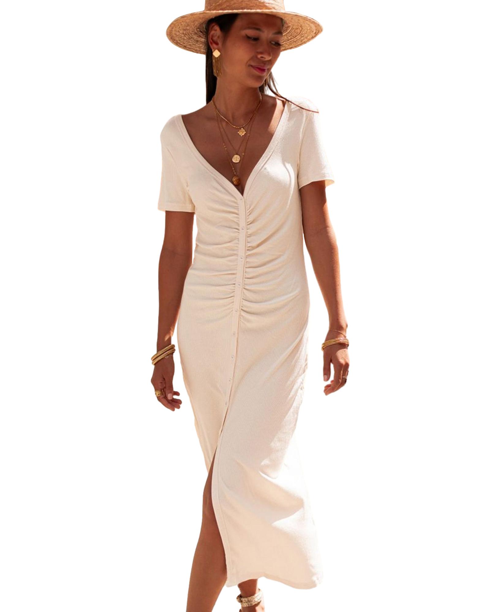 Beige V Neck Ruched Button Front French T-shirt Dress – L