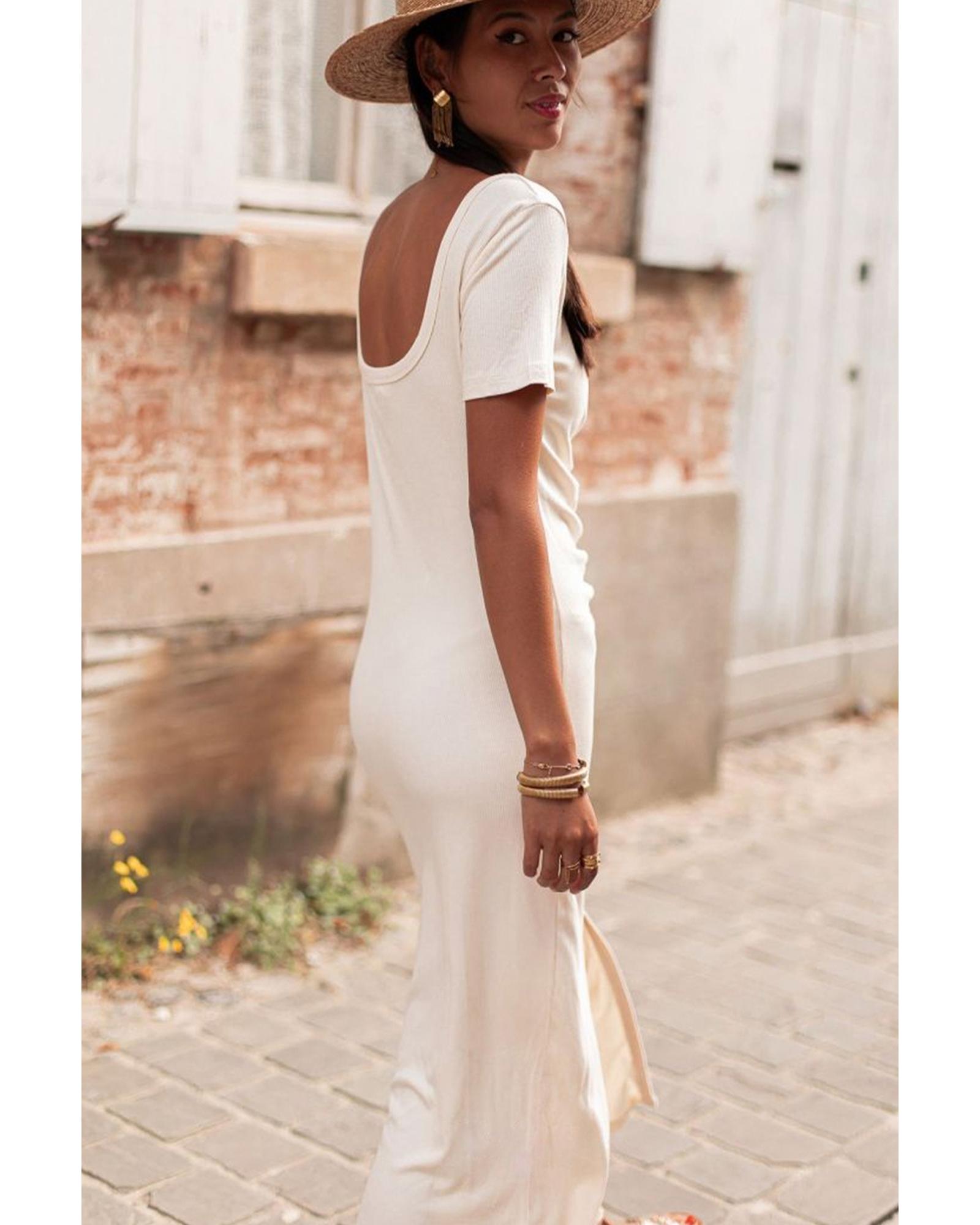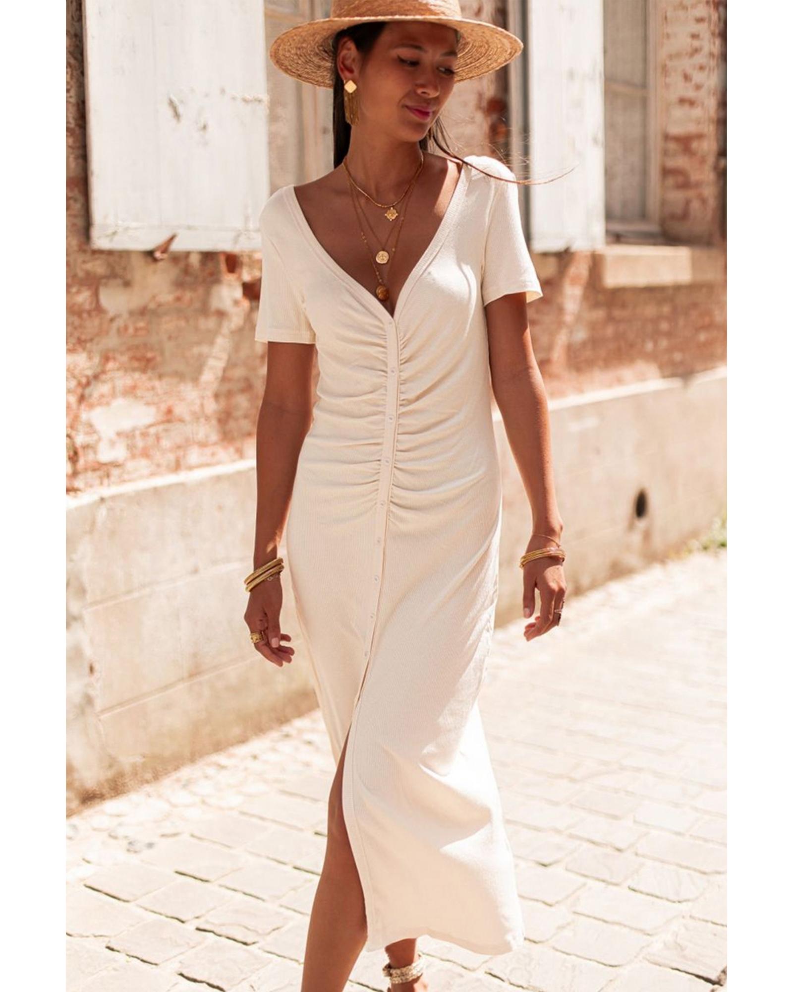 Beige V Neck Ruched Button Front French T-shirt Dress – S