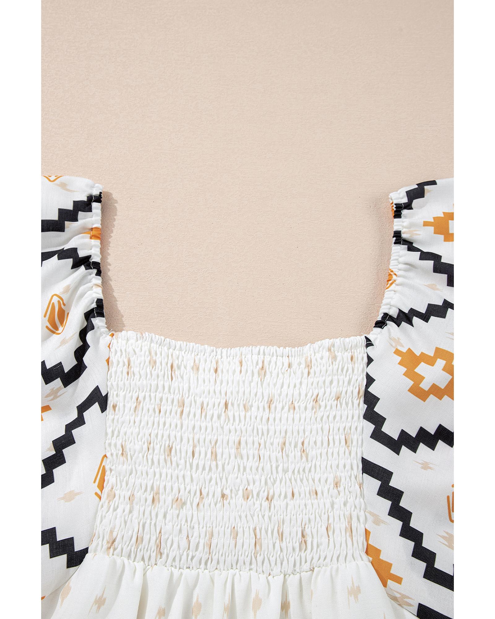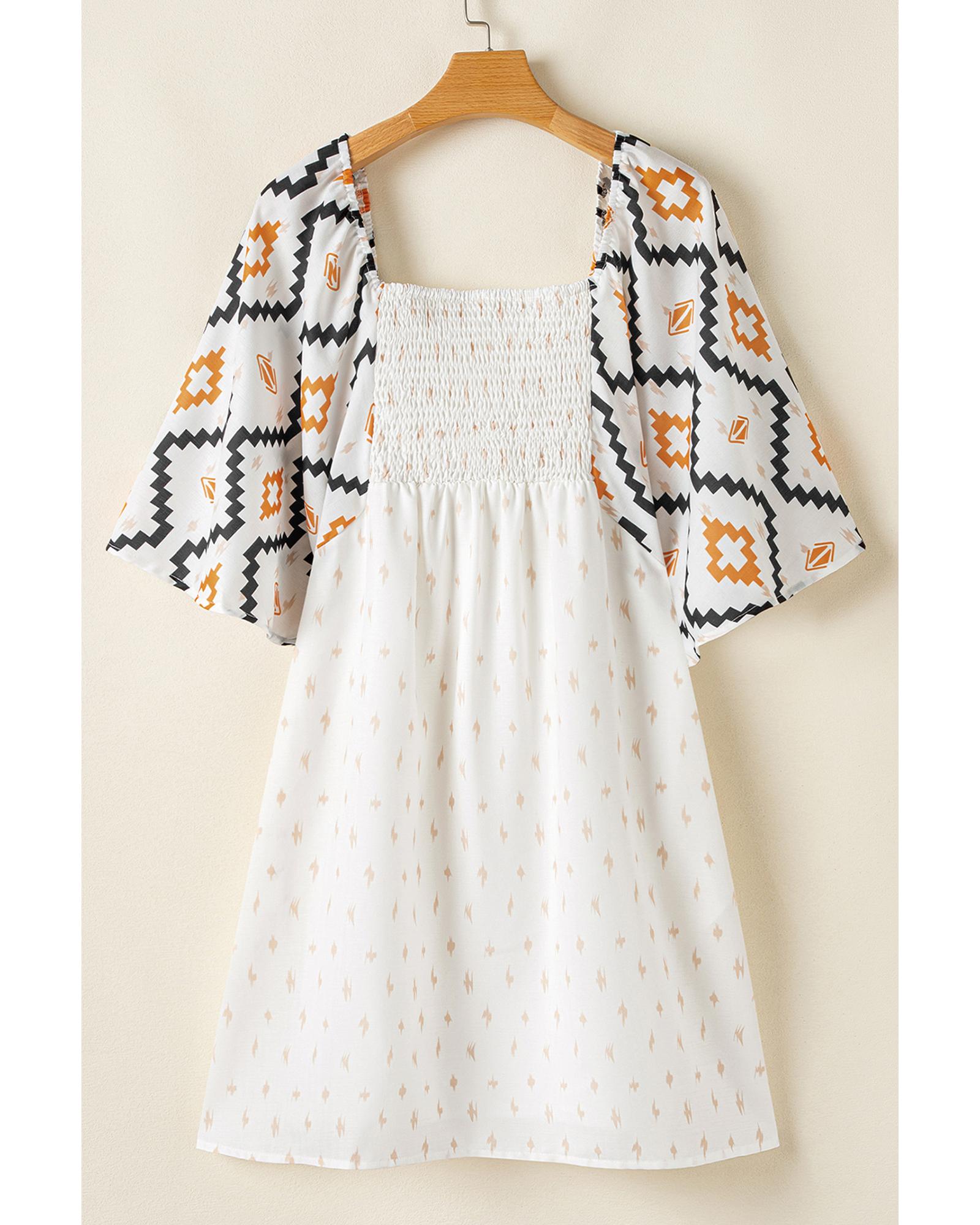 • Beige Western Aztec Print Pleated Square Neck Loose Mini Dress