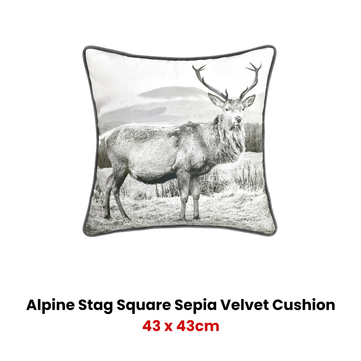 A striking Alpine Stag Taupe Jacquard Square Velvet Filled Cushion by Bianca an on-trend stag design. It is printed and depict the Victorian high country at dusk. This ensemble will surely make a statement. The cushion displays a palette of taupe, black, and grey colour tones.