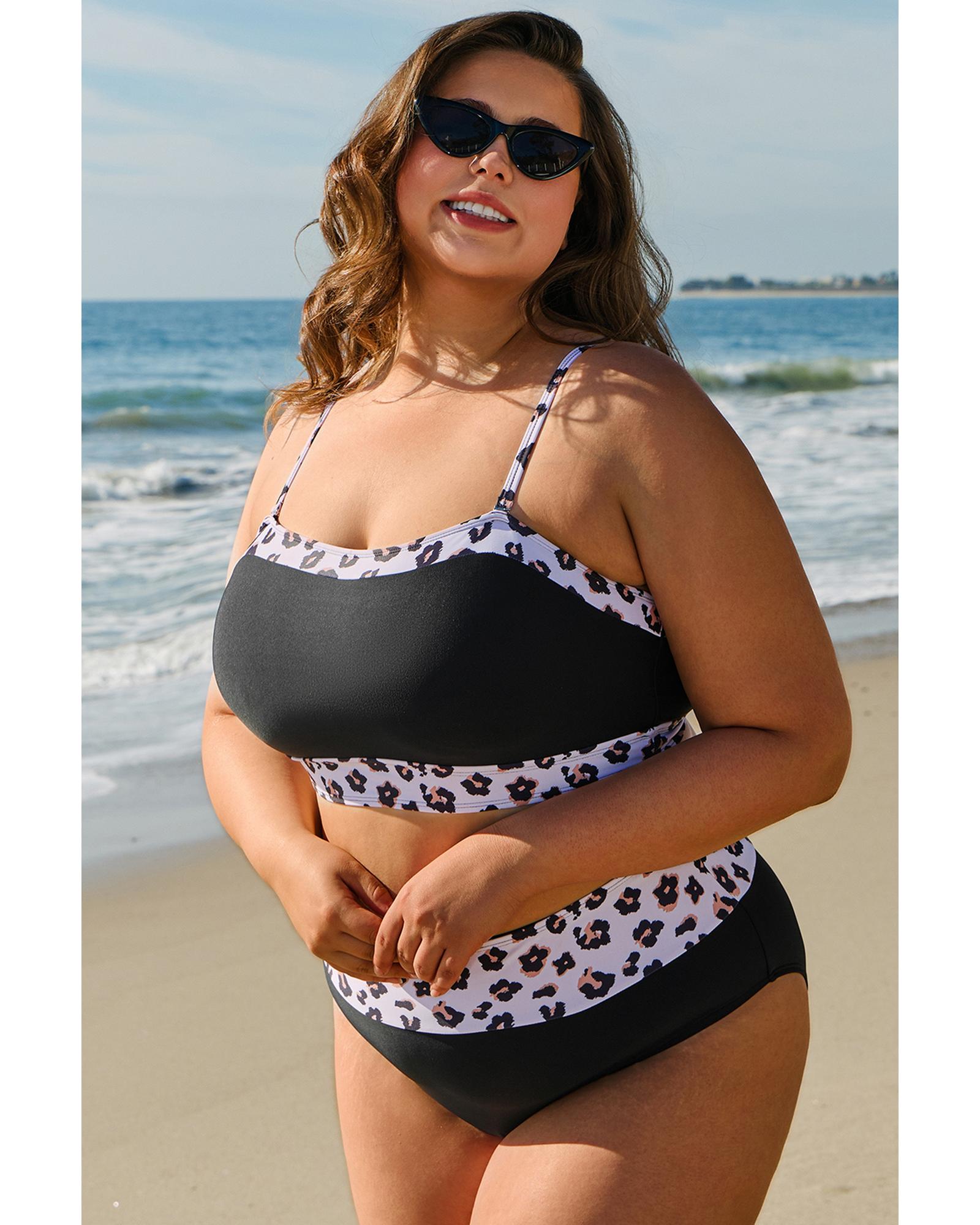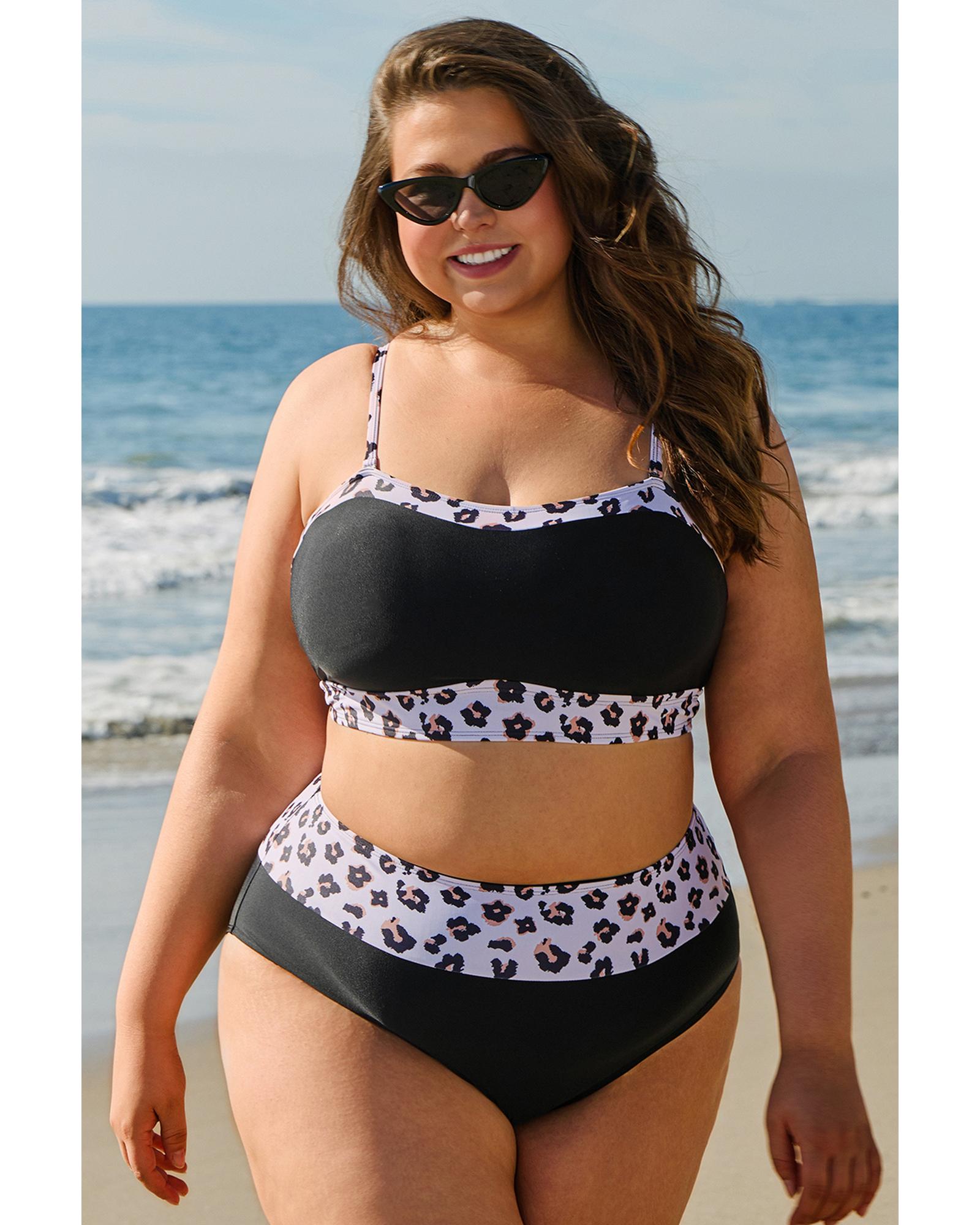 Black 2pcs Leopard Patchwork Plus Size High Waisted Swimsuit – 2X