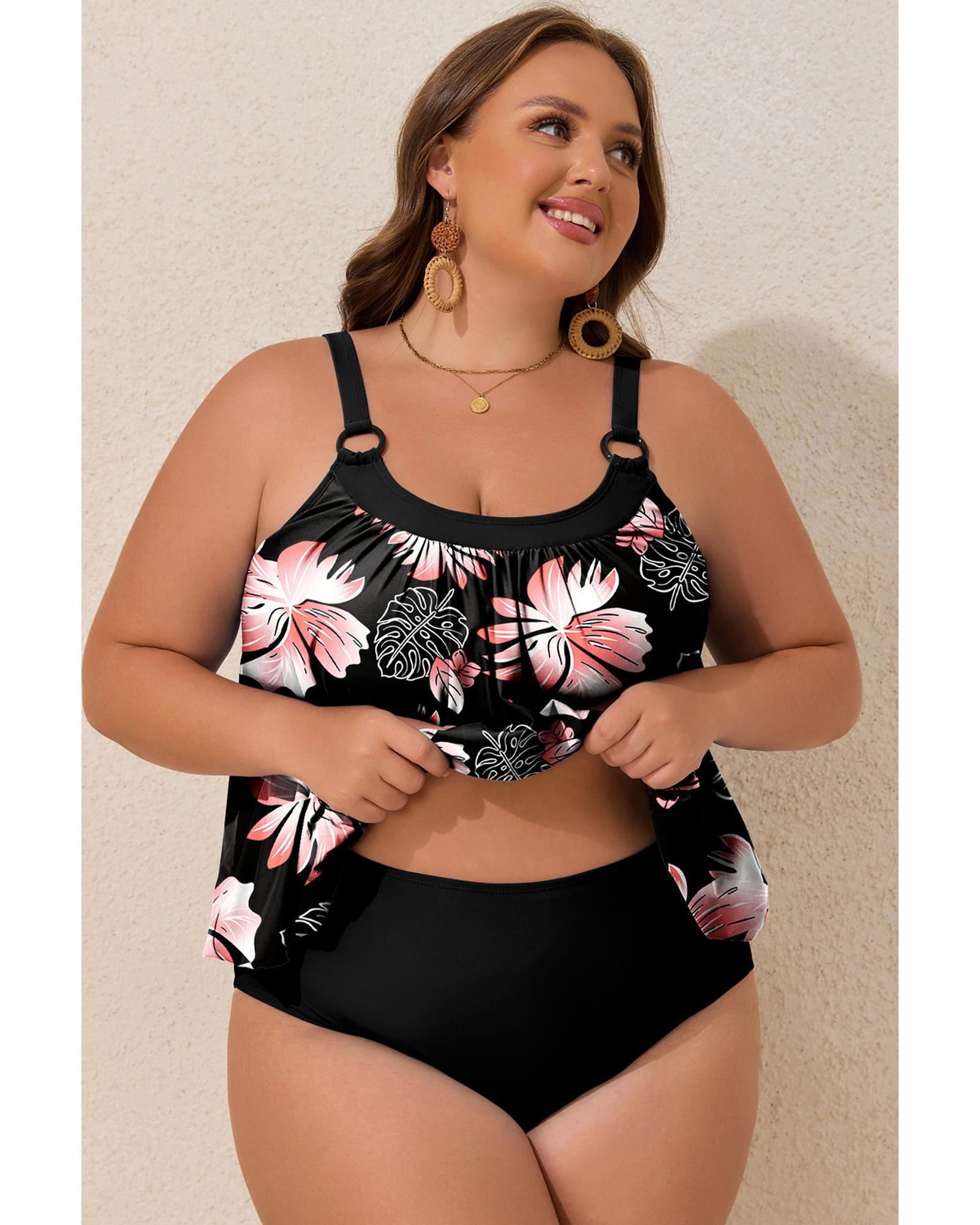 Black 2pcs Plus Size Wide Strap Floral Top Tankini Set – 2X