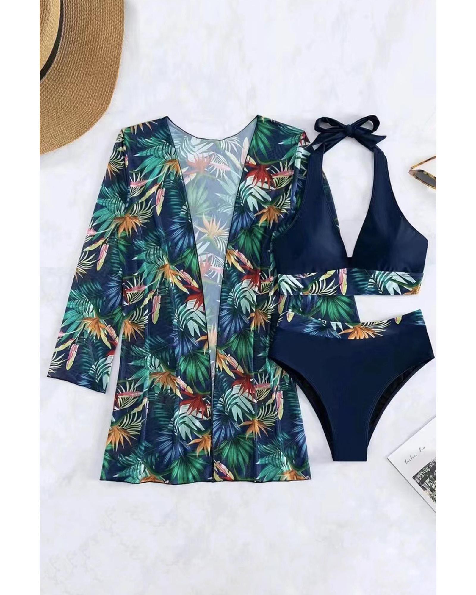 Black 3pcs Tropical Contrast Trim Halter Bikini Set with Cover up – S