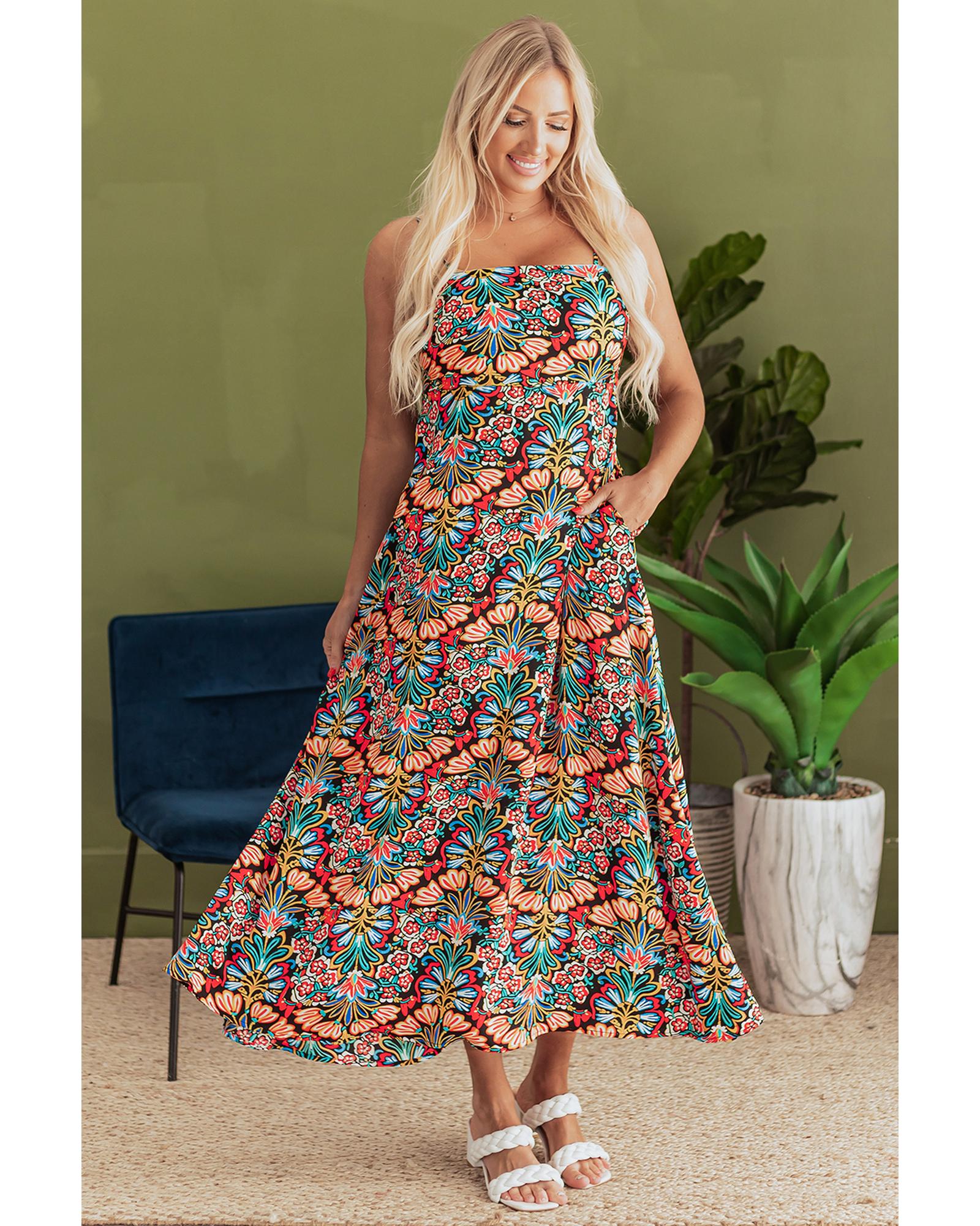 Black Boho Floral Print Thin Straps Sleeveless High Waist Maxi Dress – XL
