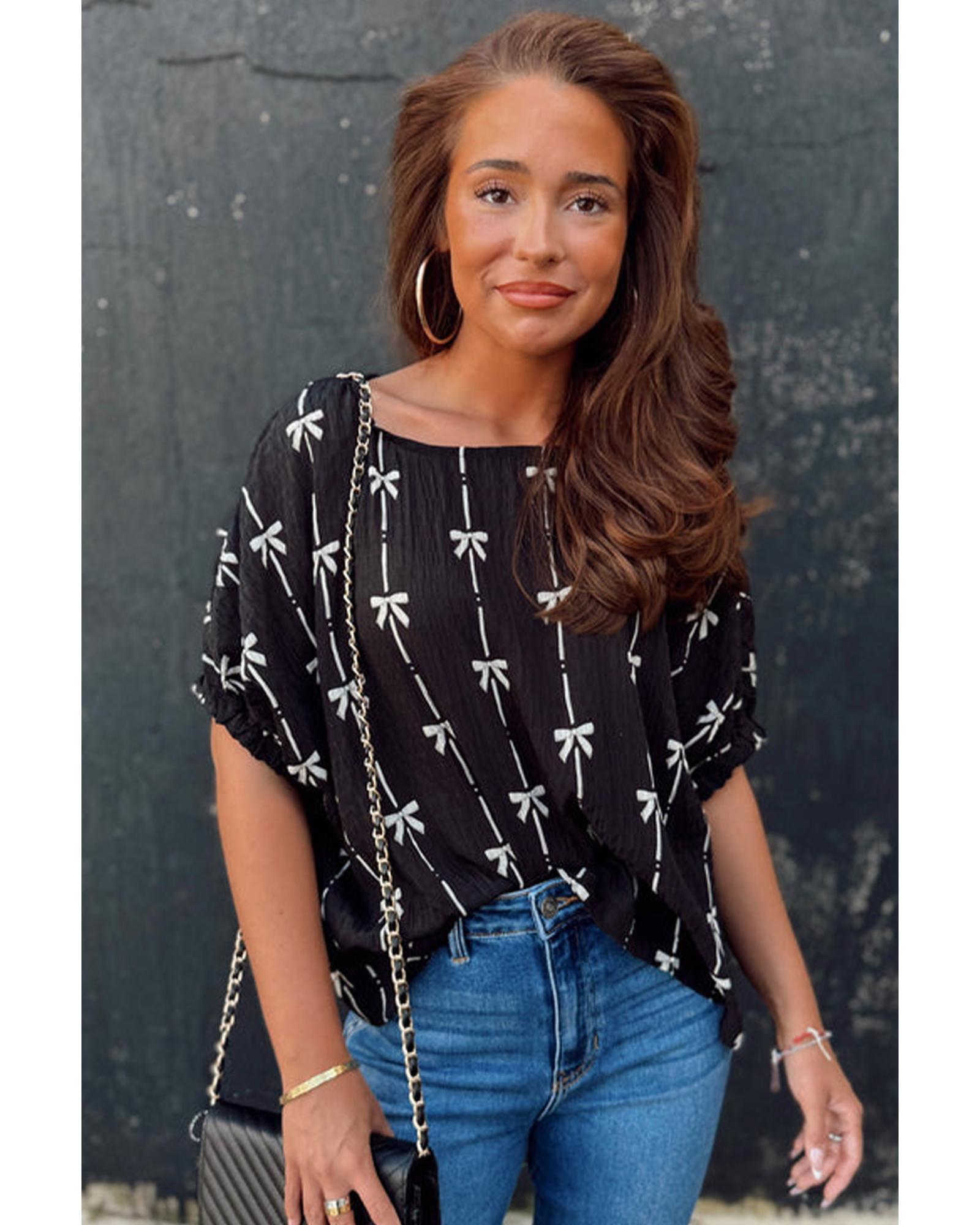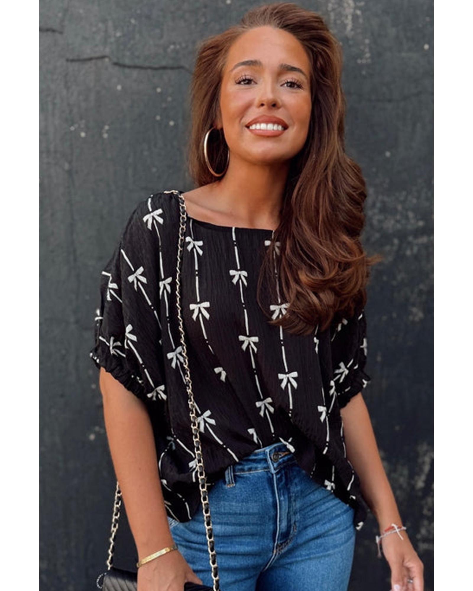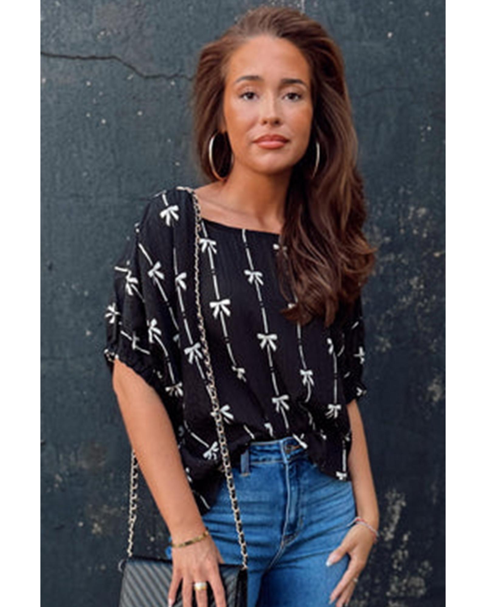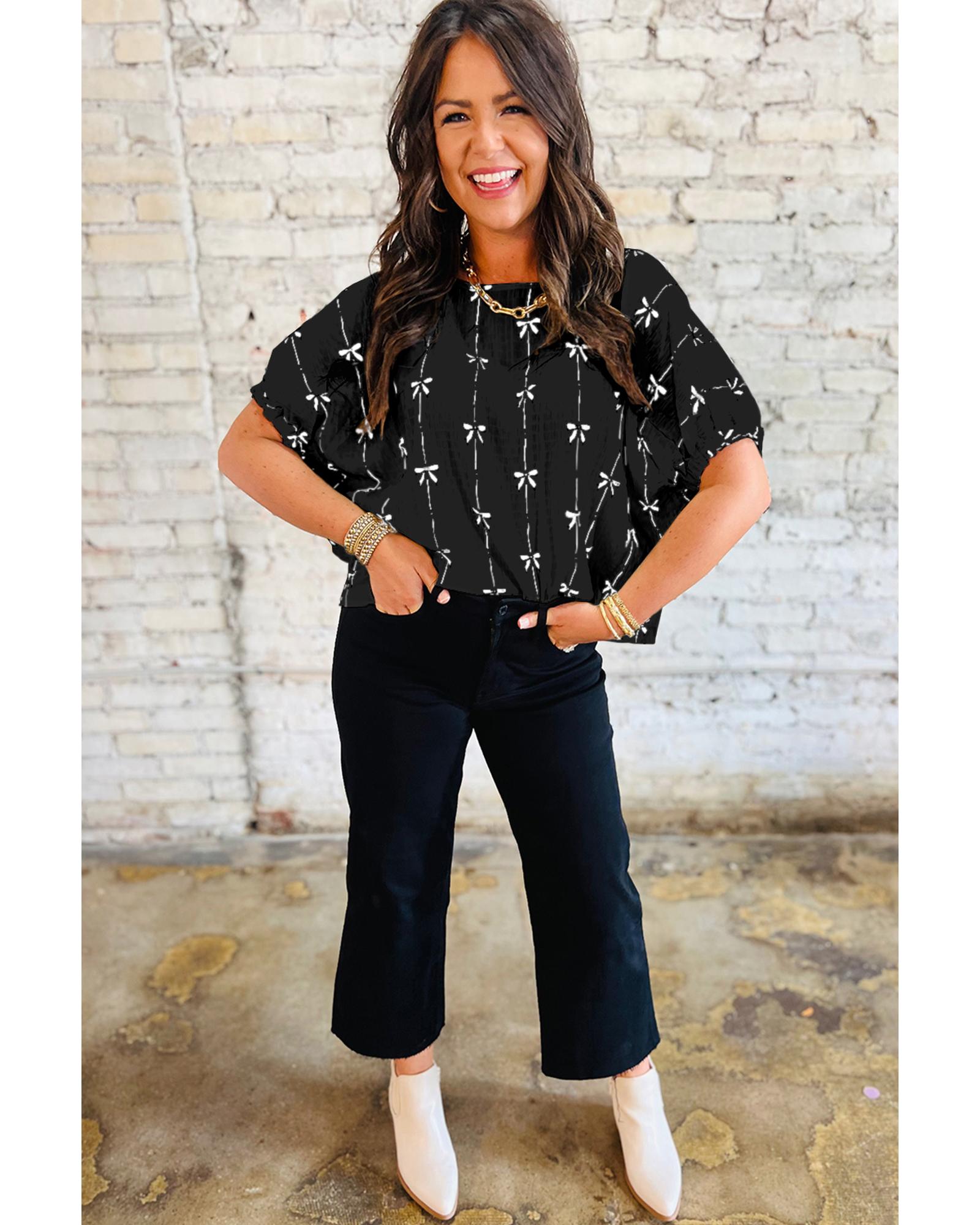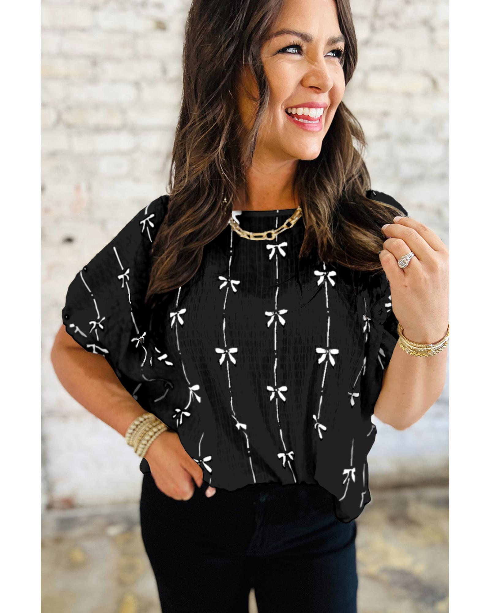 Black Bow Print Puff Short Sleeve Top – S