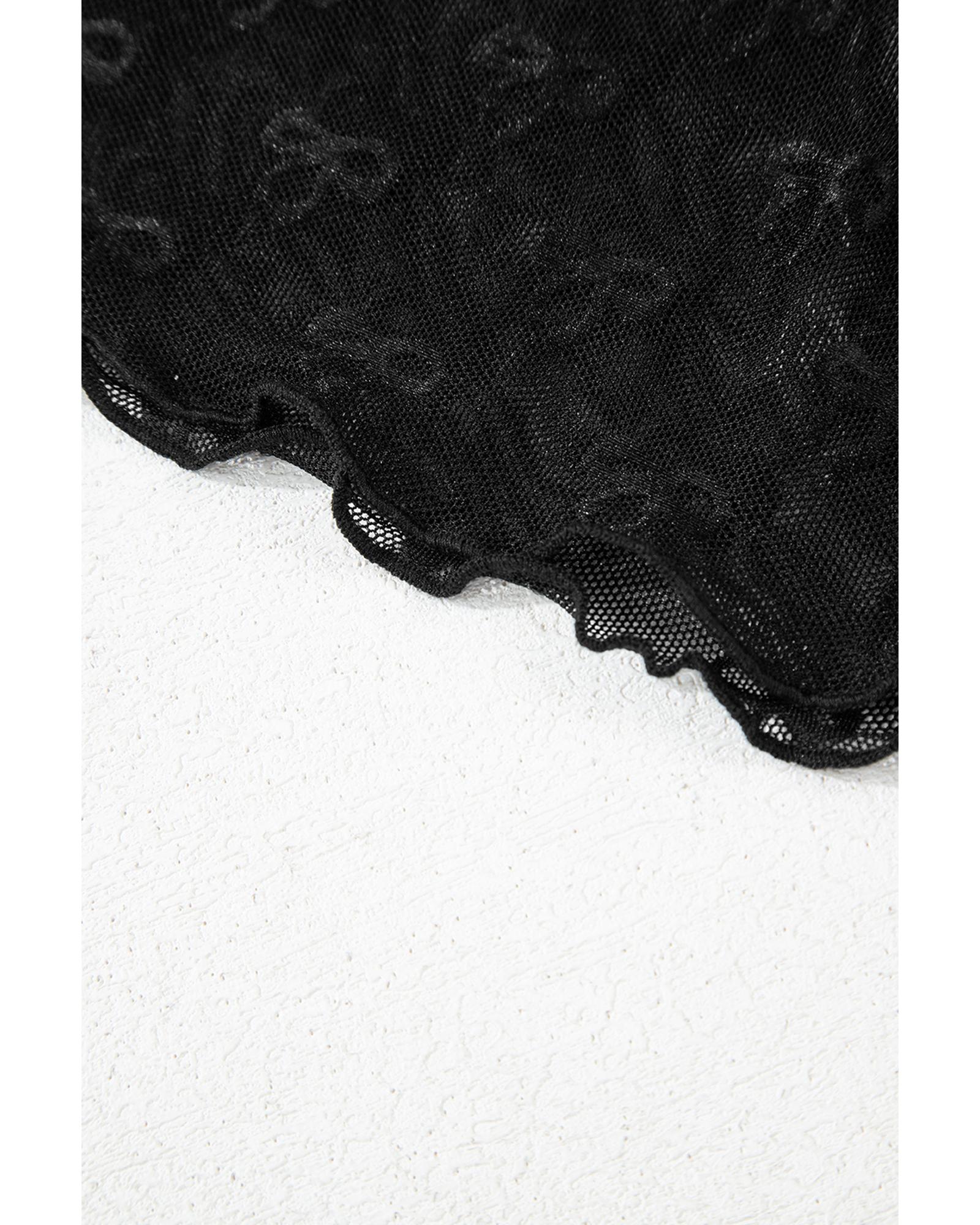 Black Bowknot Sheer Mesh Mock Neck Lettuce Trim Short Sleeve Top – S