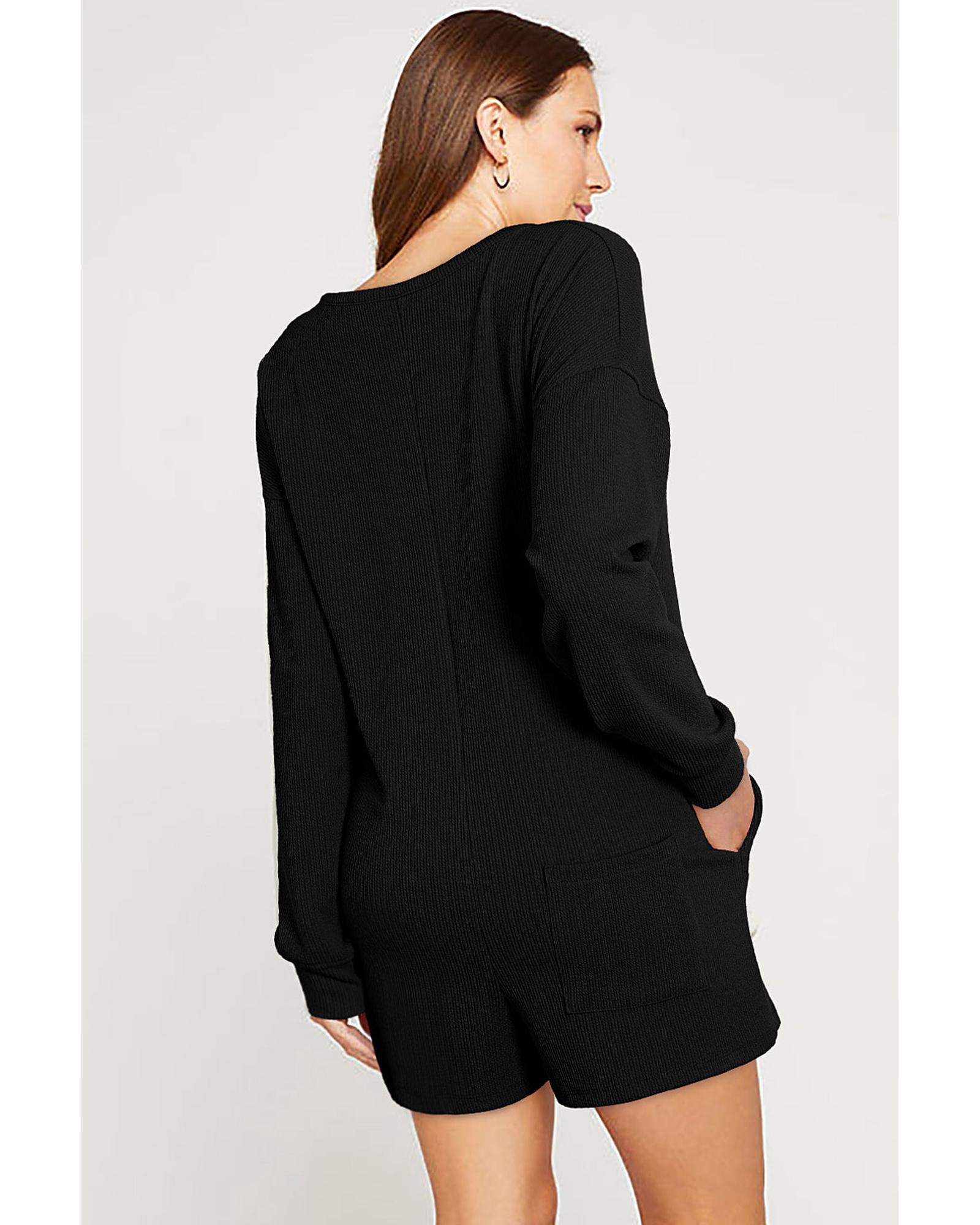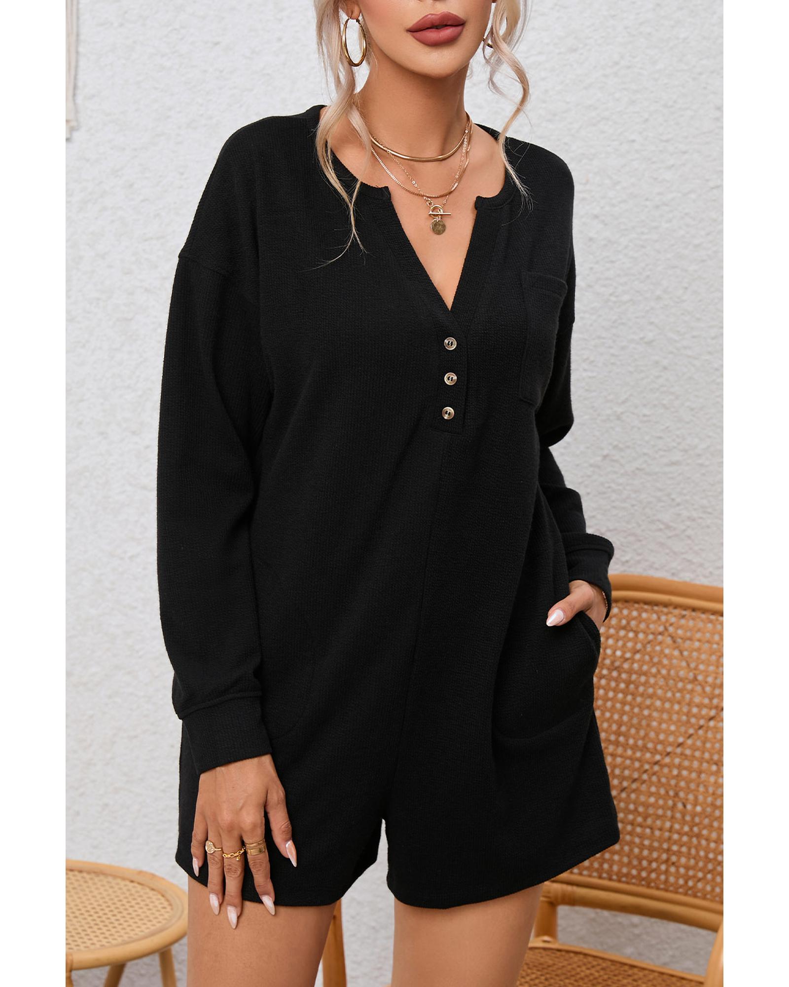 Black Brushed Ribbed Button Split V Neck Long Sleeve Romper – XL