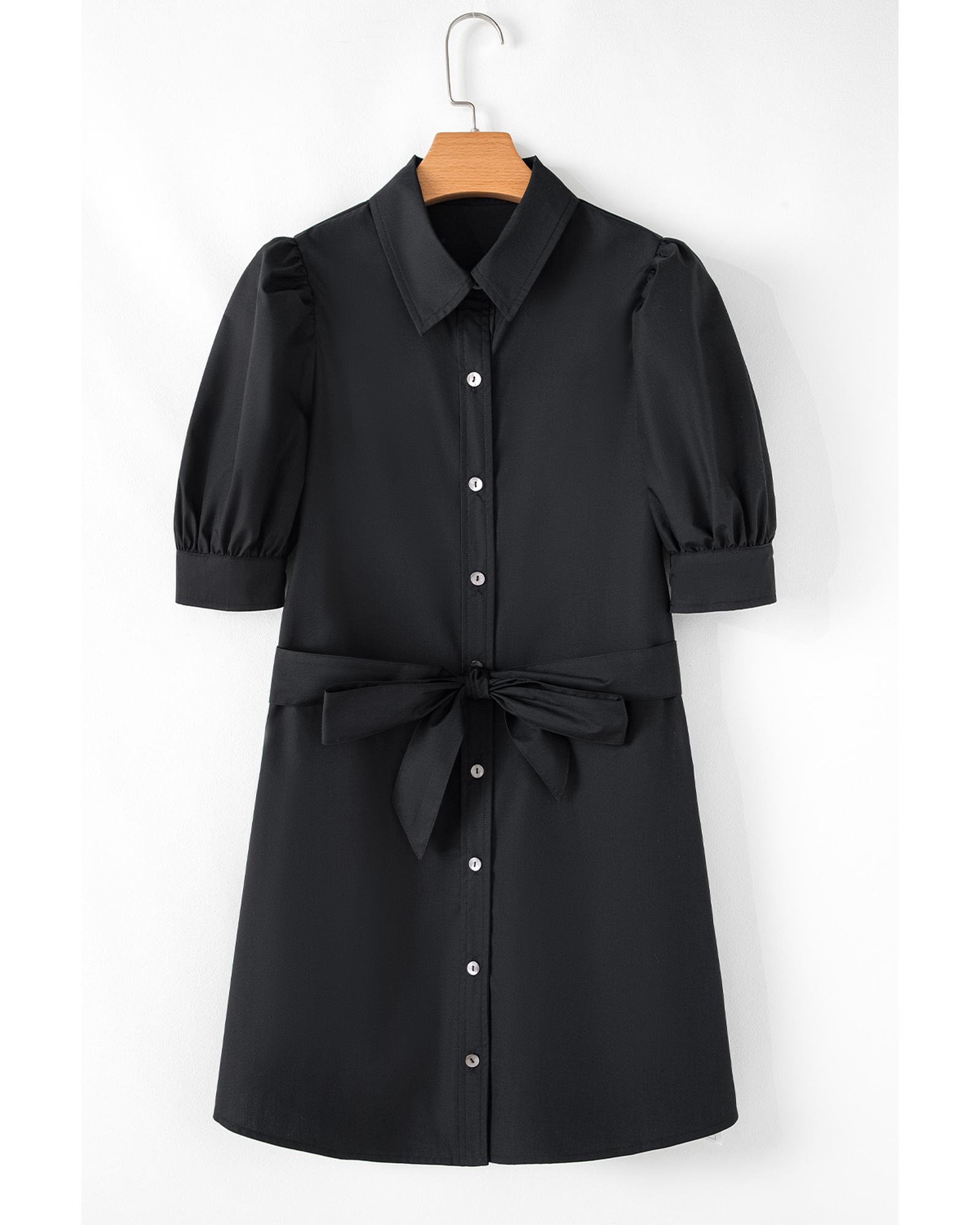 Black Button Up Tie Waist Puff Sleeve Mini Dress – L