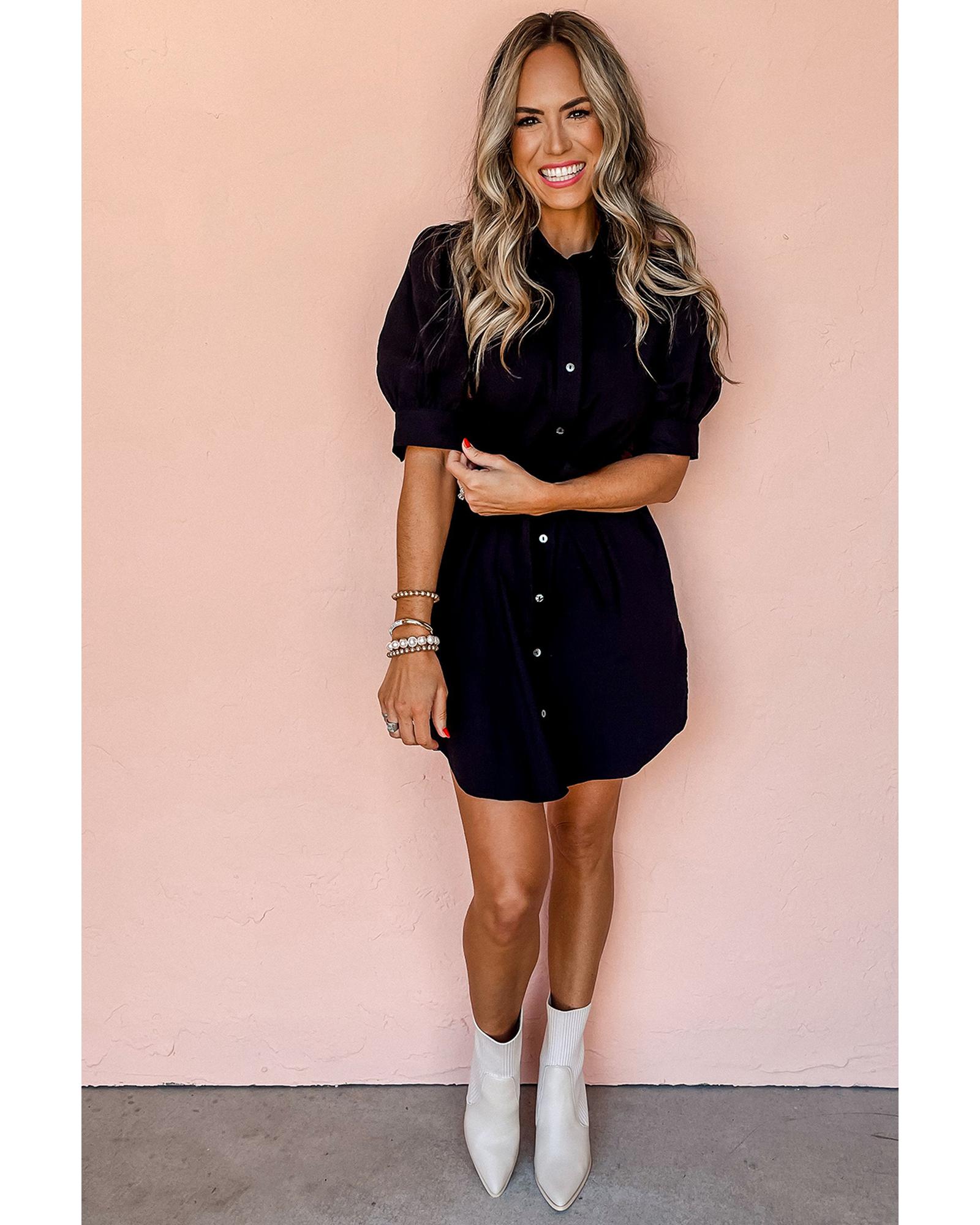 Black Button Up Tie Waist Puff Sleeve Mini Dress – M