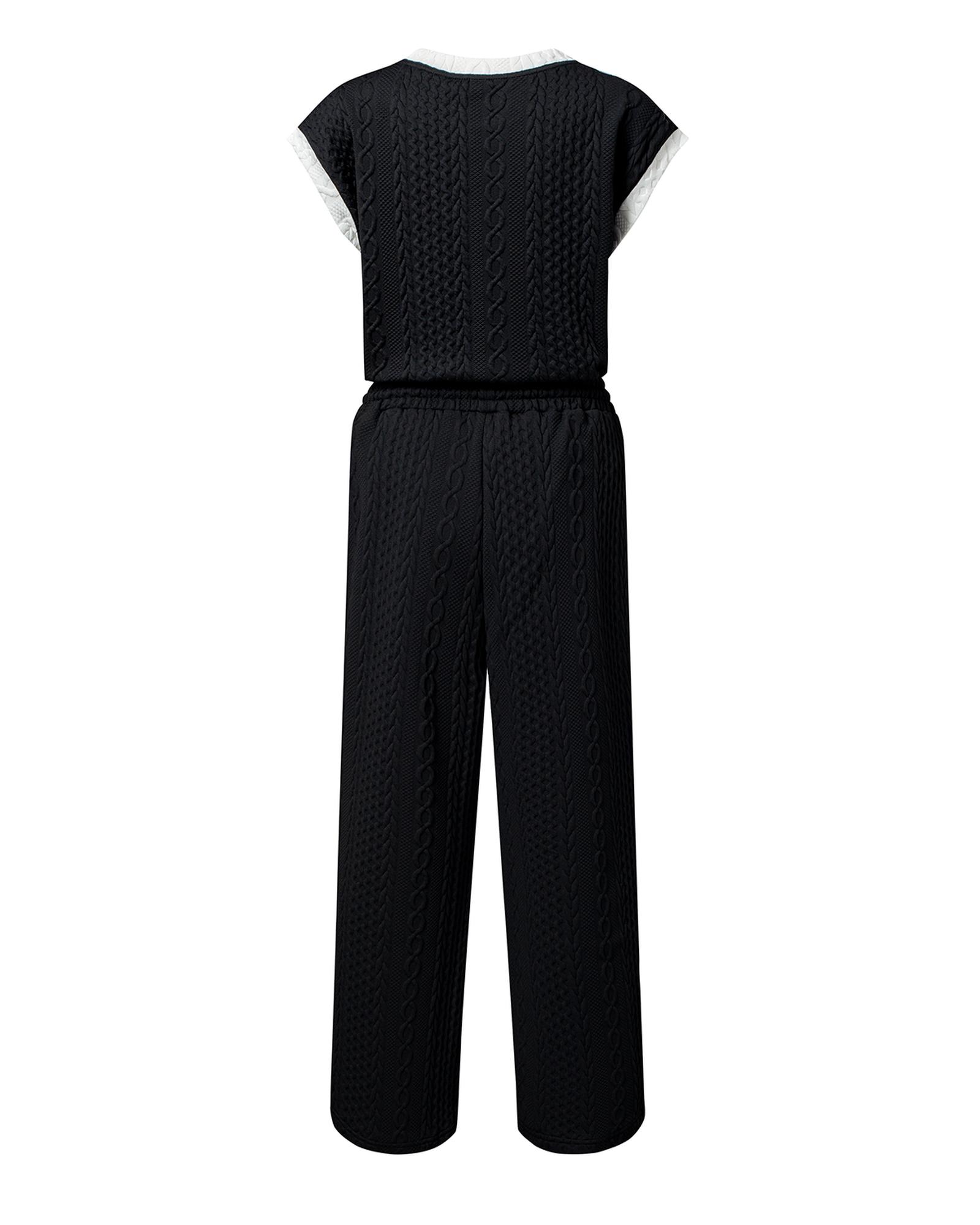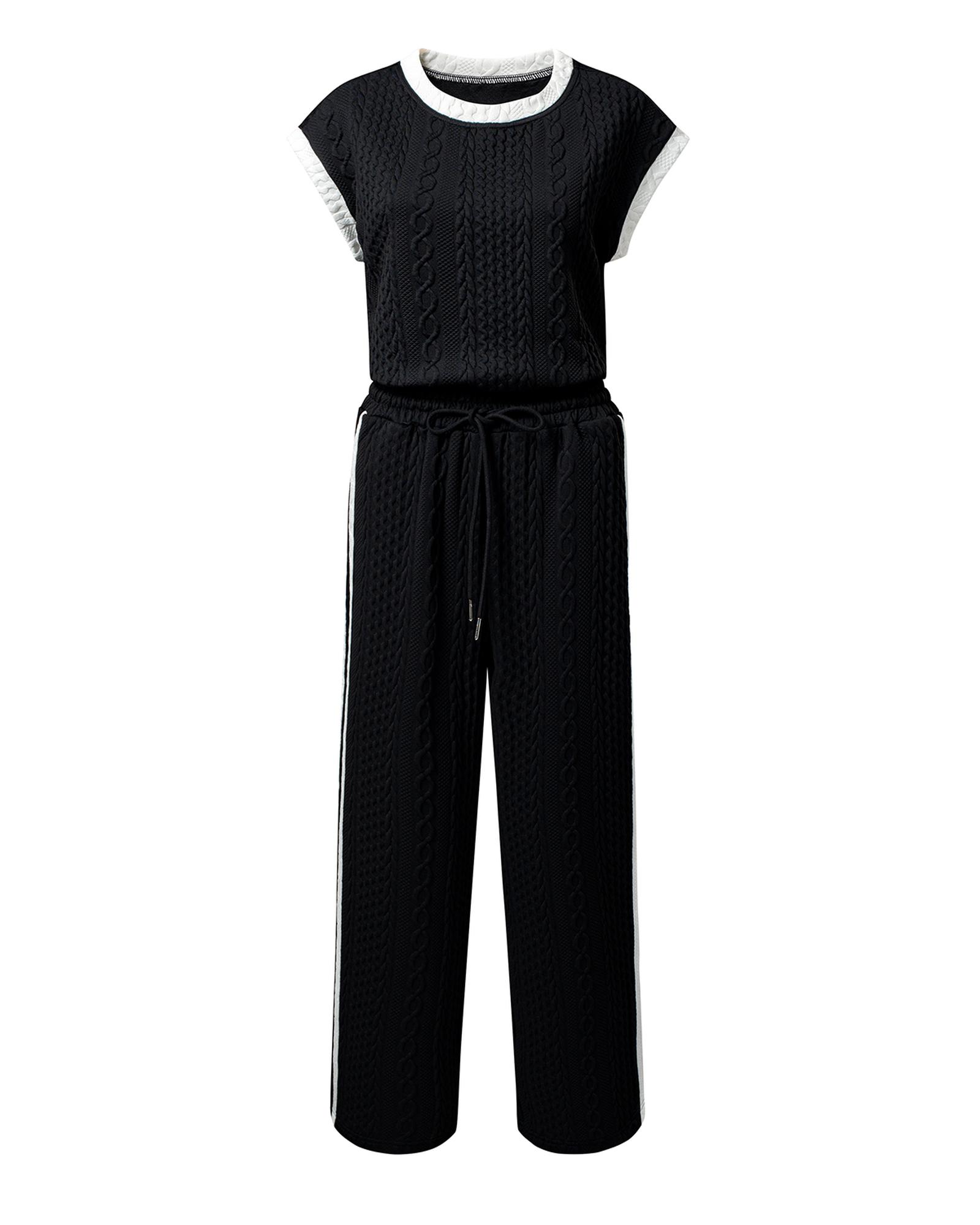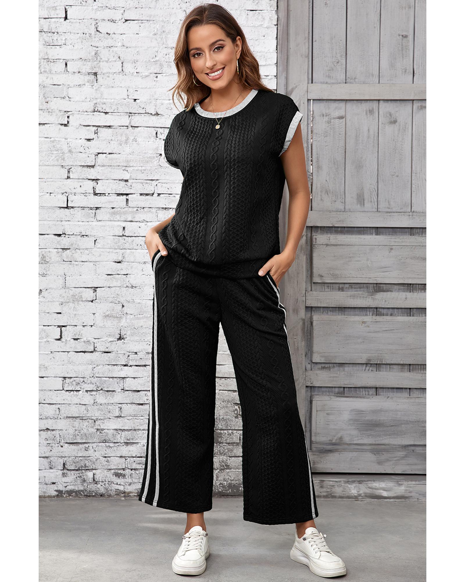 Black Cable Knit Contrast Trim Short Sleeve Top and Pants Set – L