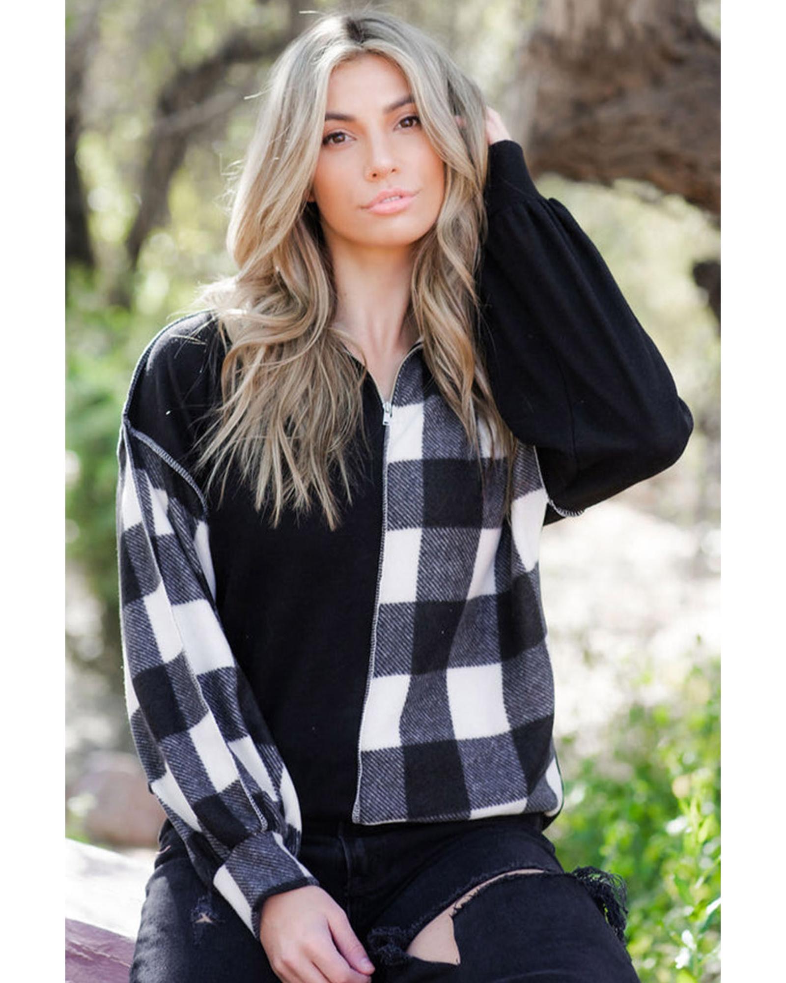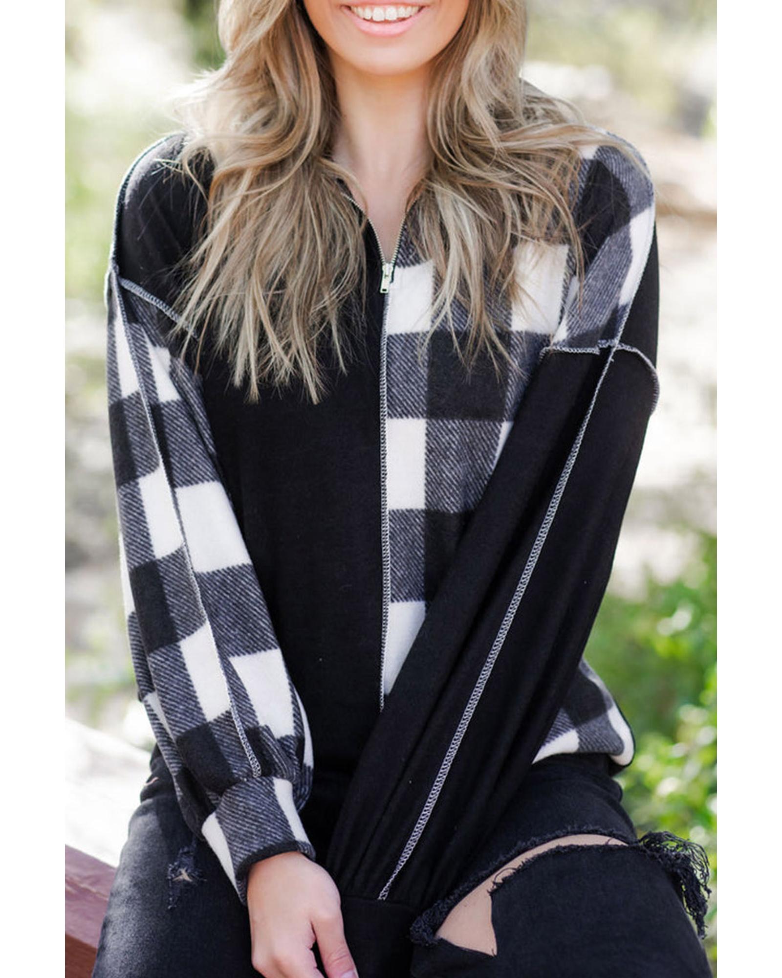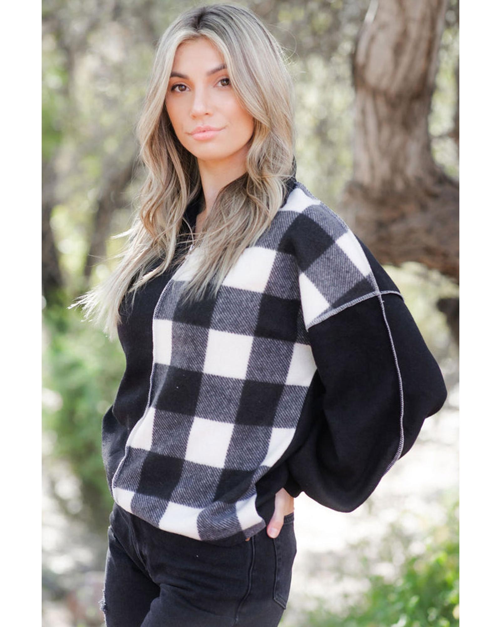 - Unisex Black Checkboard Patchwork Exposed Stitching Collared Top