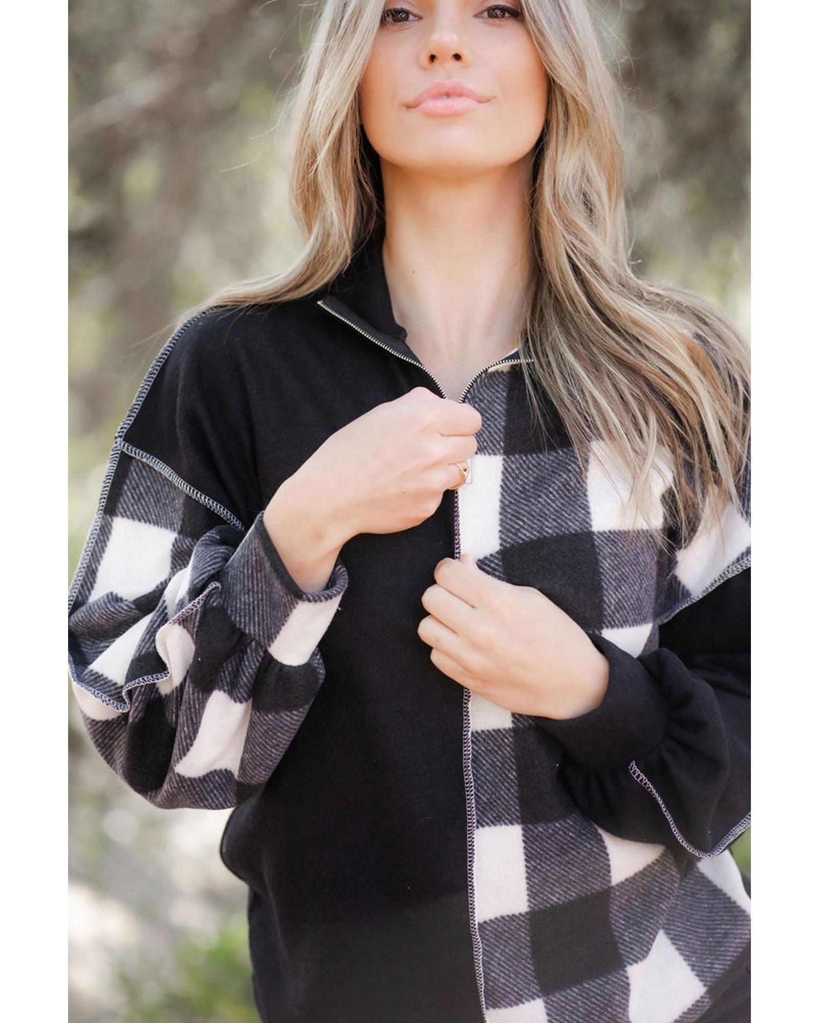 Black Checkboard Patchwork Exposed Stitching Collared Top – M