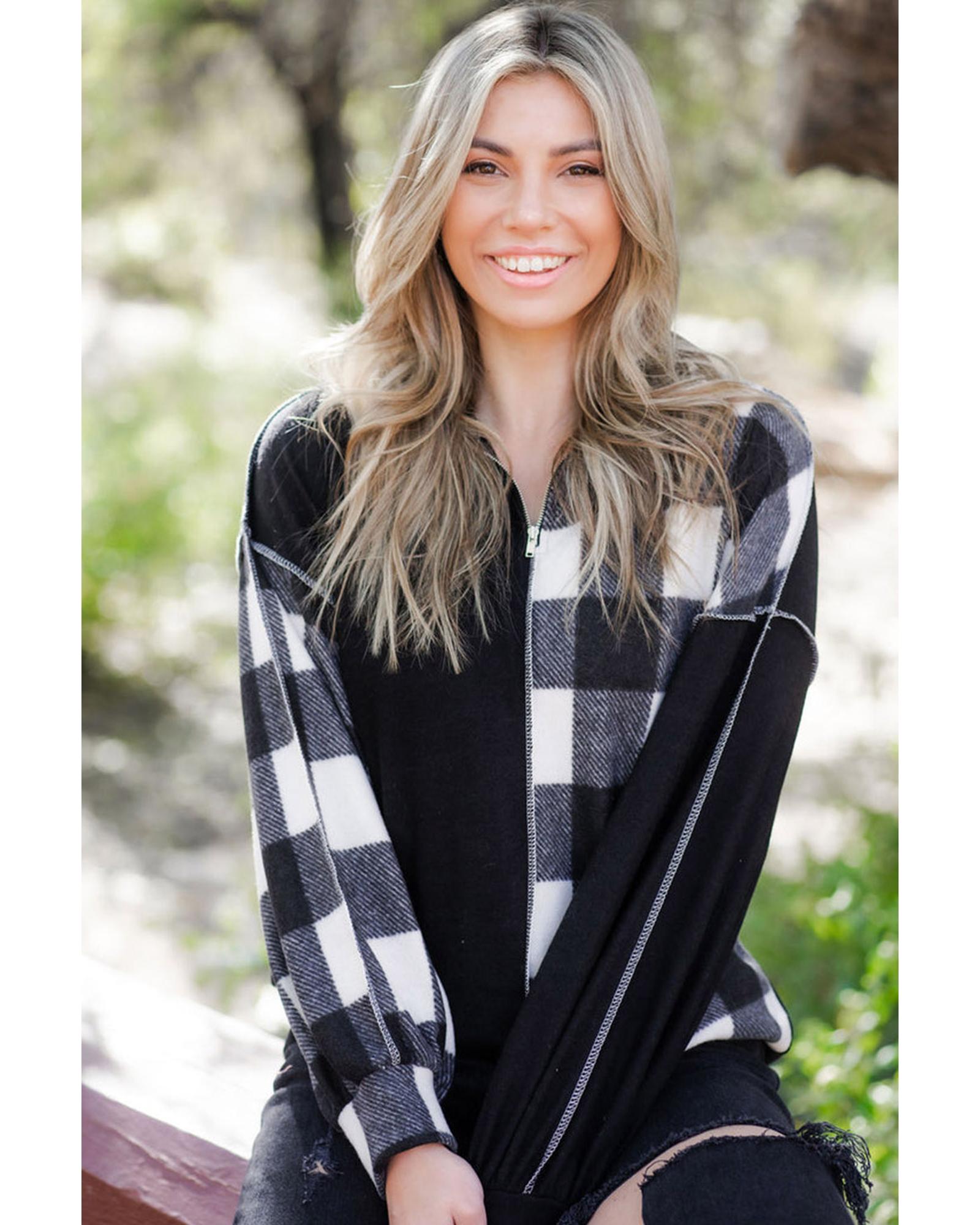 Black Checkboard Patchwork Exposed Stitching Collared Top – S