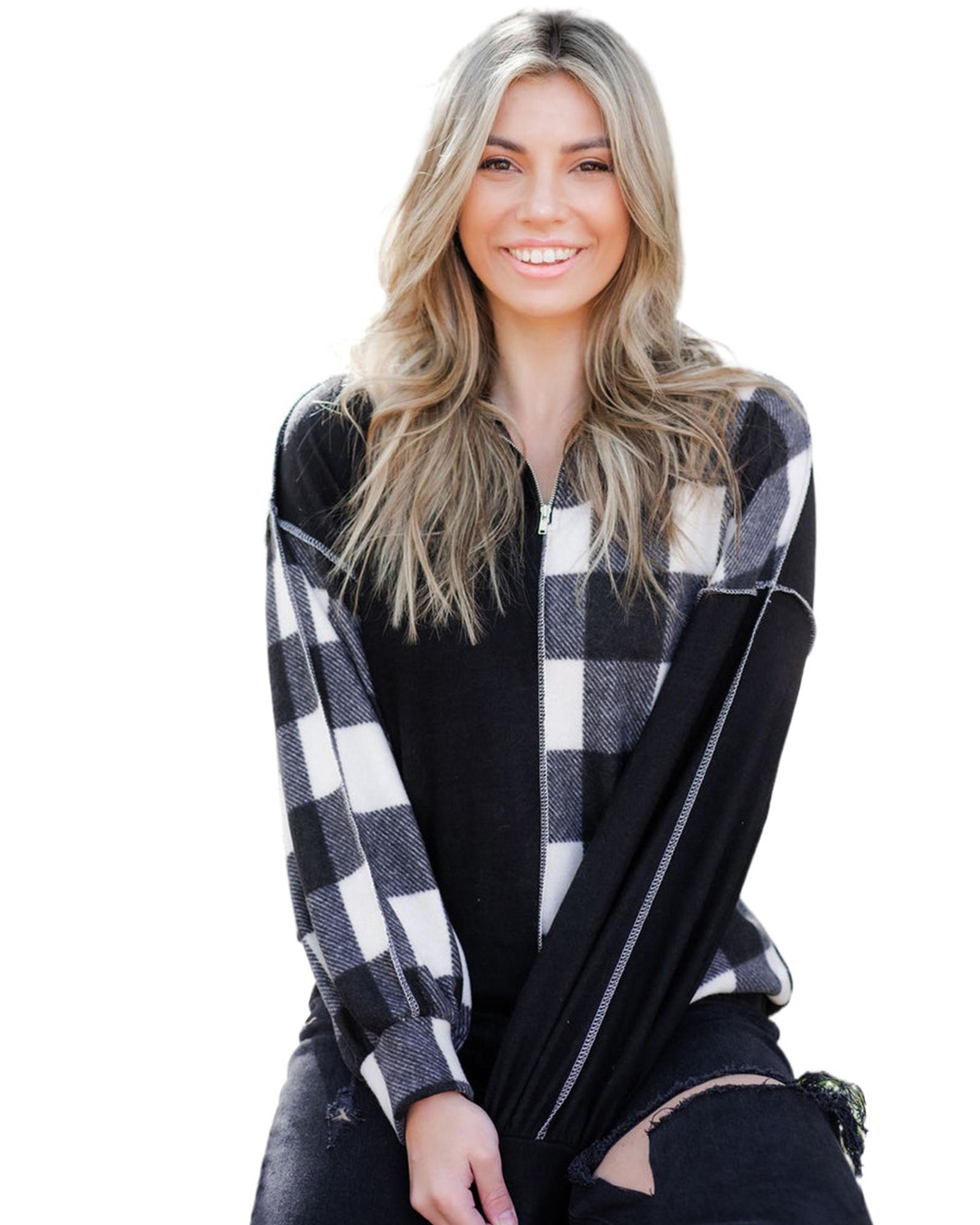 - Unisex Black Checkboard Patchwork Exposed Stitching Collared Top
