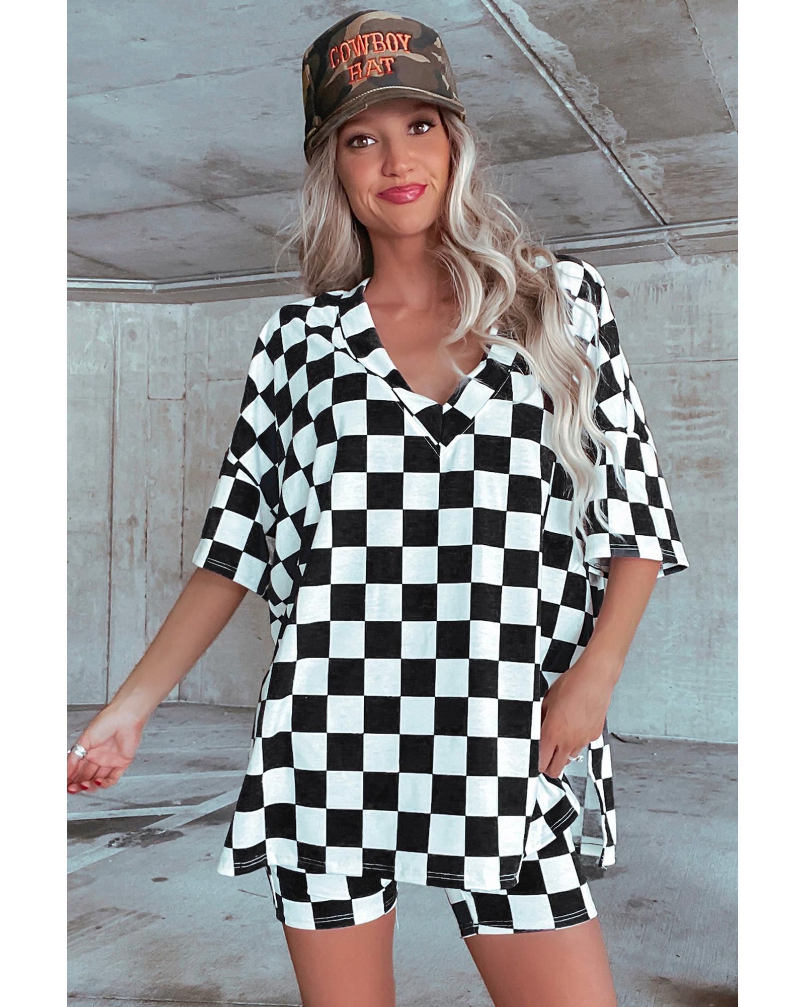Black Checkerboard Print V Neck Loose Tee and Shorts Lounge Set – L