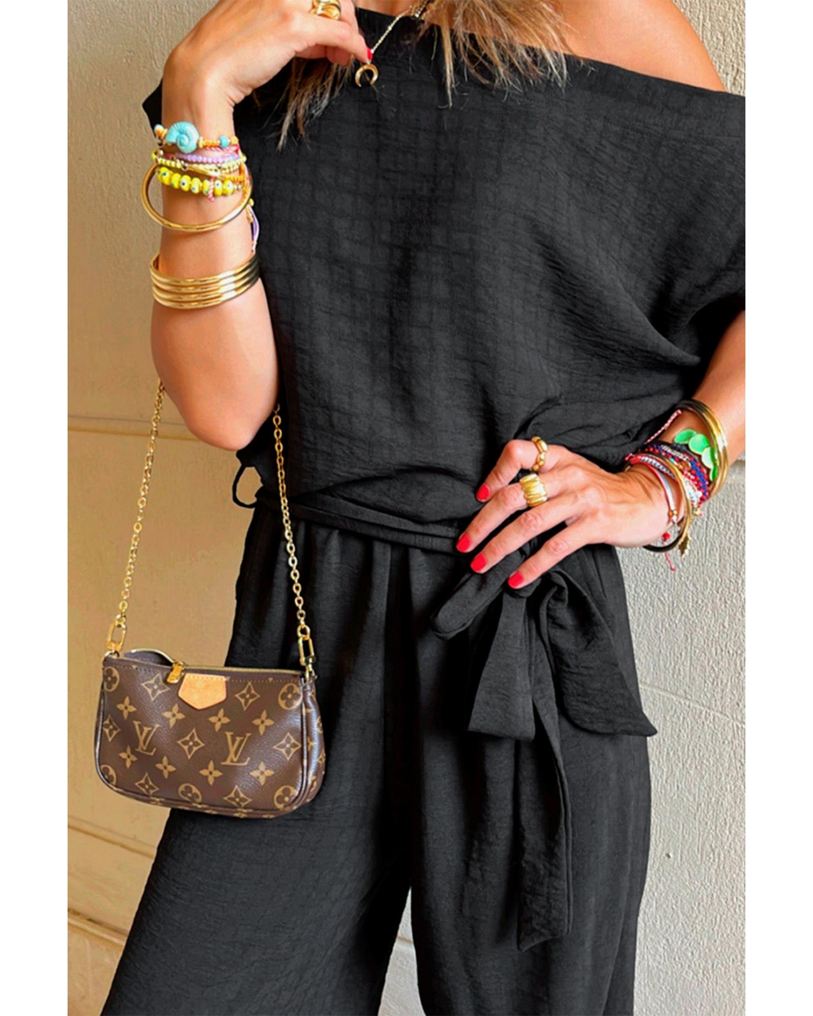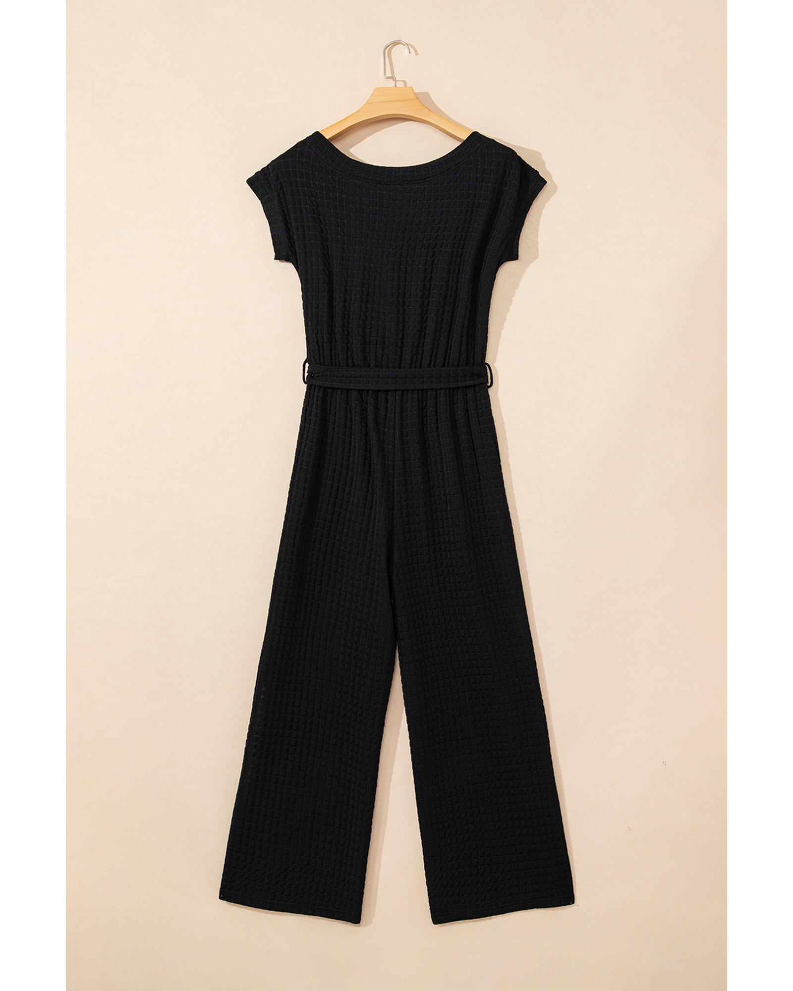 Black Checkered Mesh One Shoulder Short Sleeve Knotted Waist Jumpsuit – L
