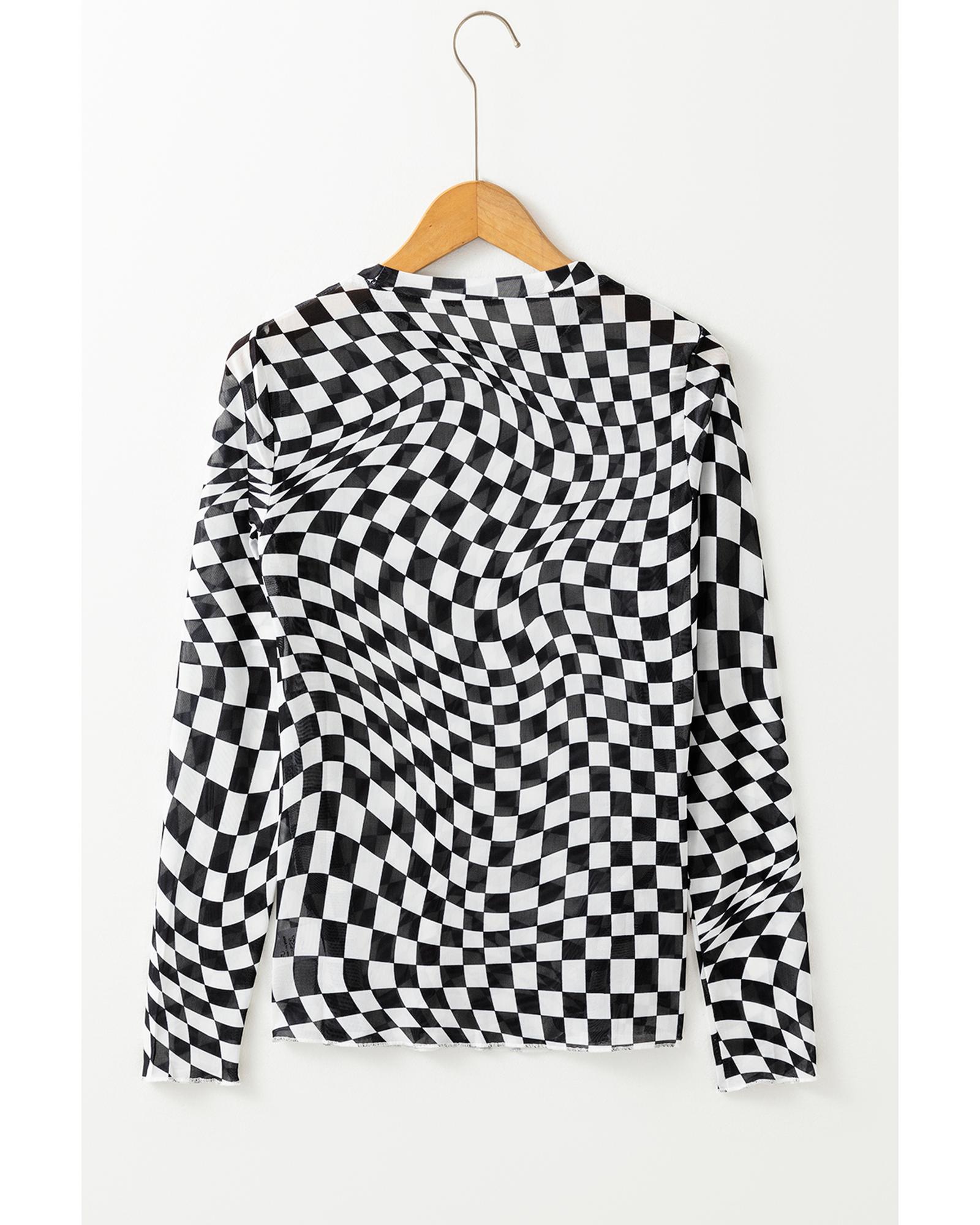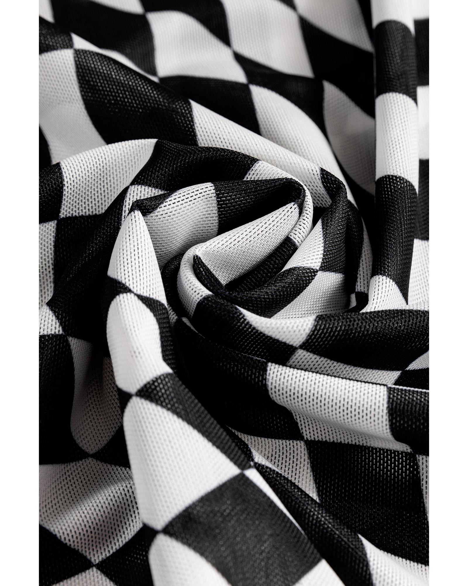 Black Checkered Pattern Mesh Mock Neck Long Sleeve Top – XL