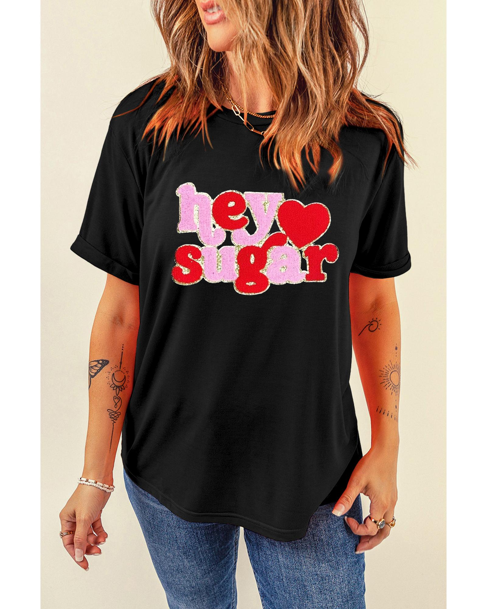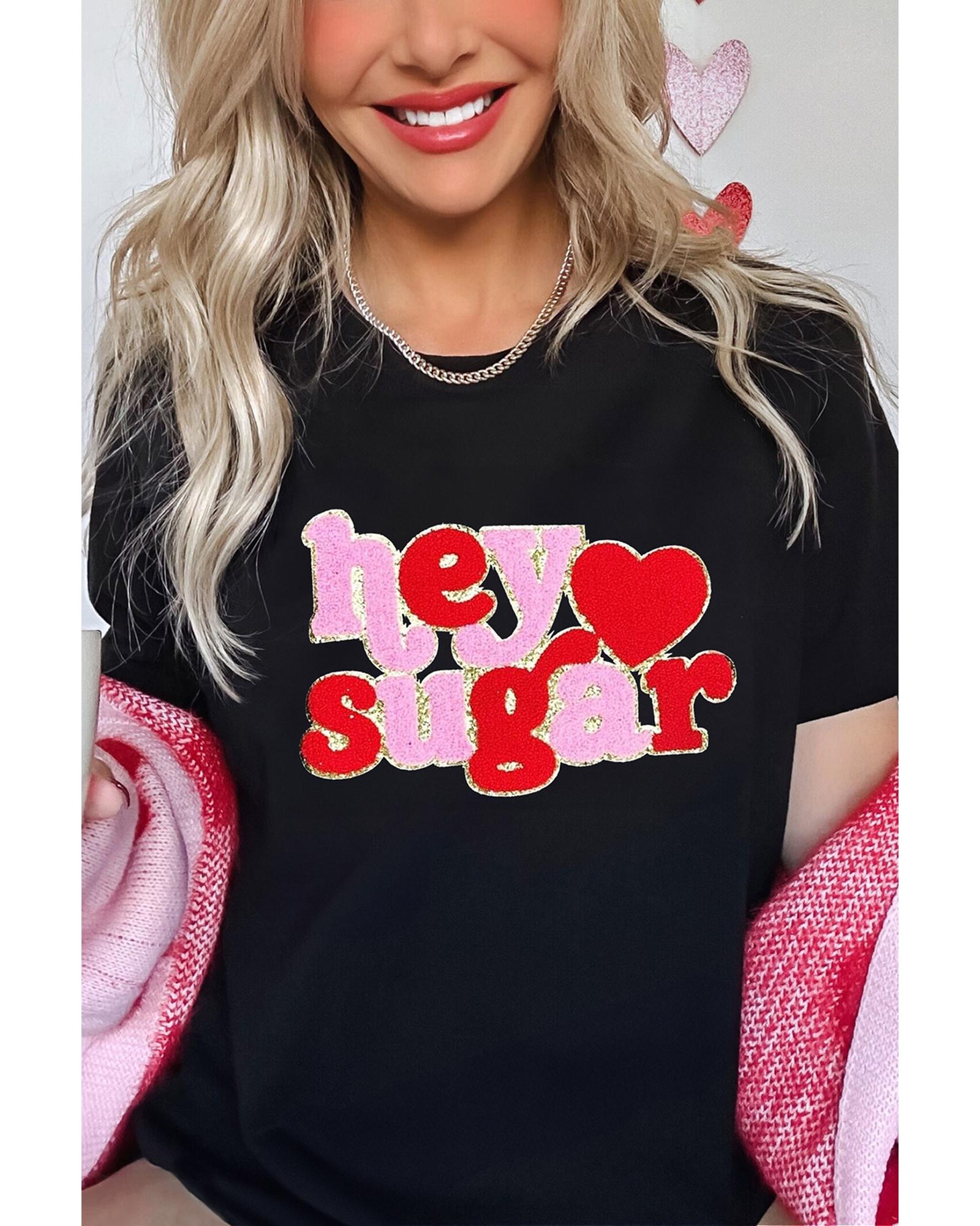 Black Chenille Heart hey sugar Patched Crewneck Valentines Tee – M