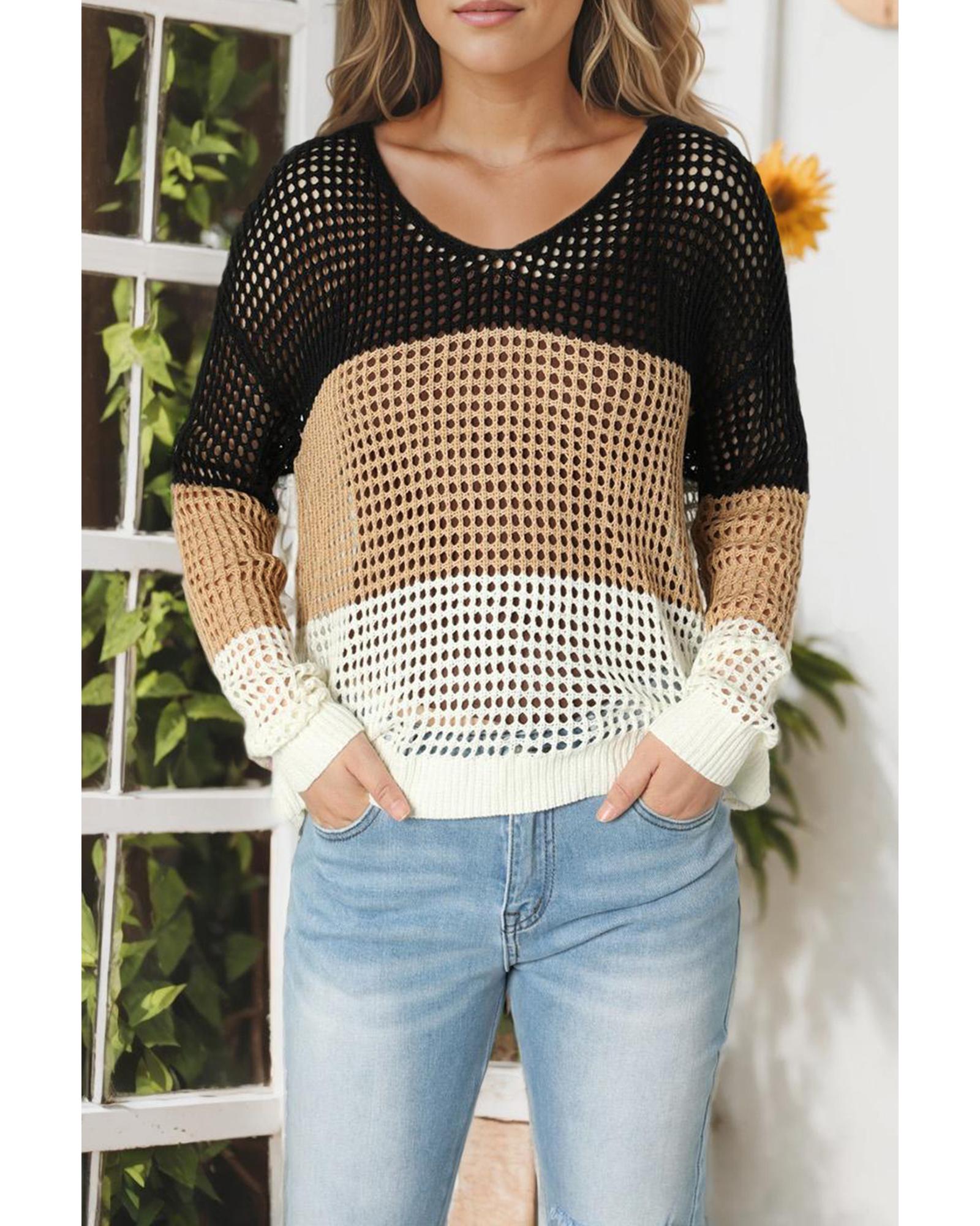 - Black color block eyelet long sleeve twisted back knit top