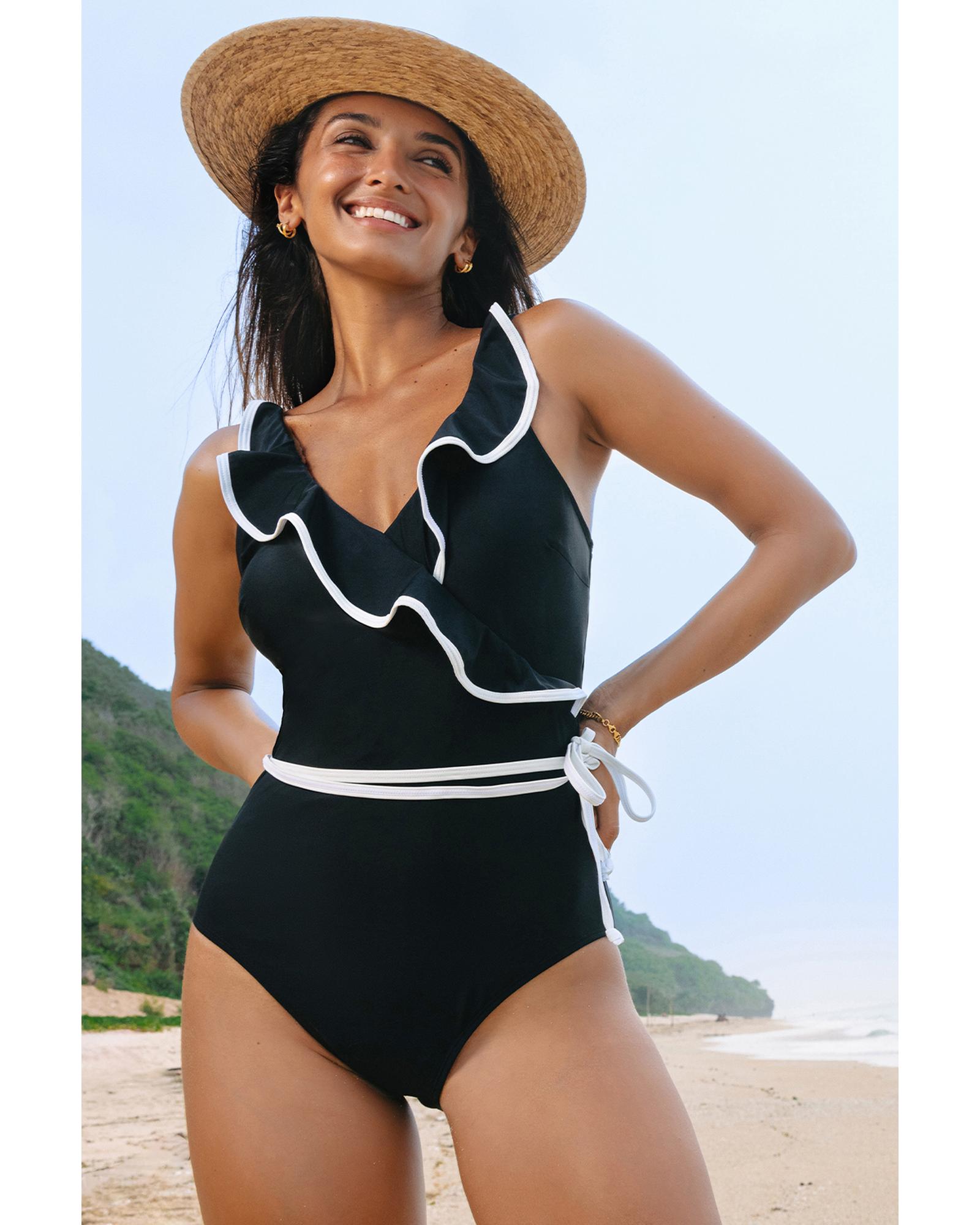 Black Color Contrast Ruffled Wrap V Neck Swimsuit – XL