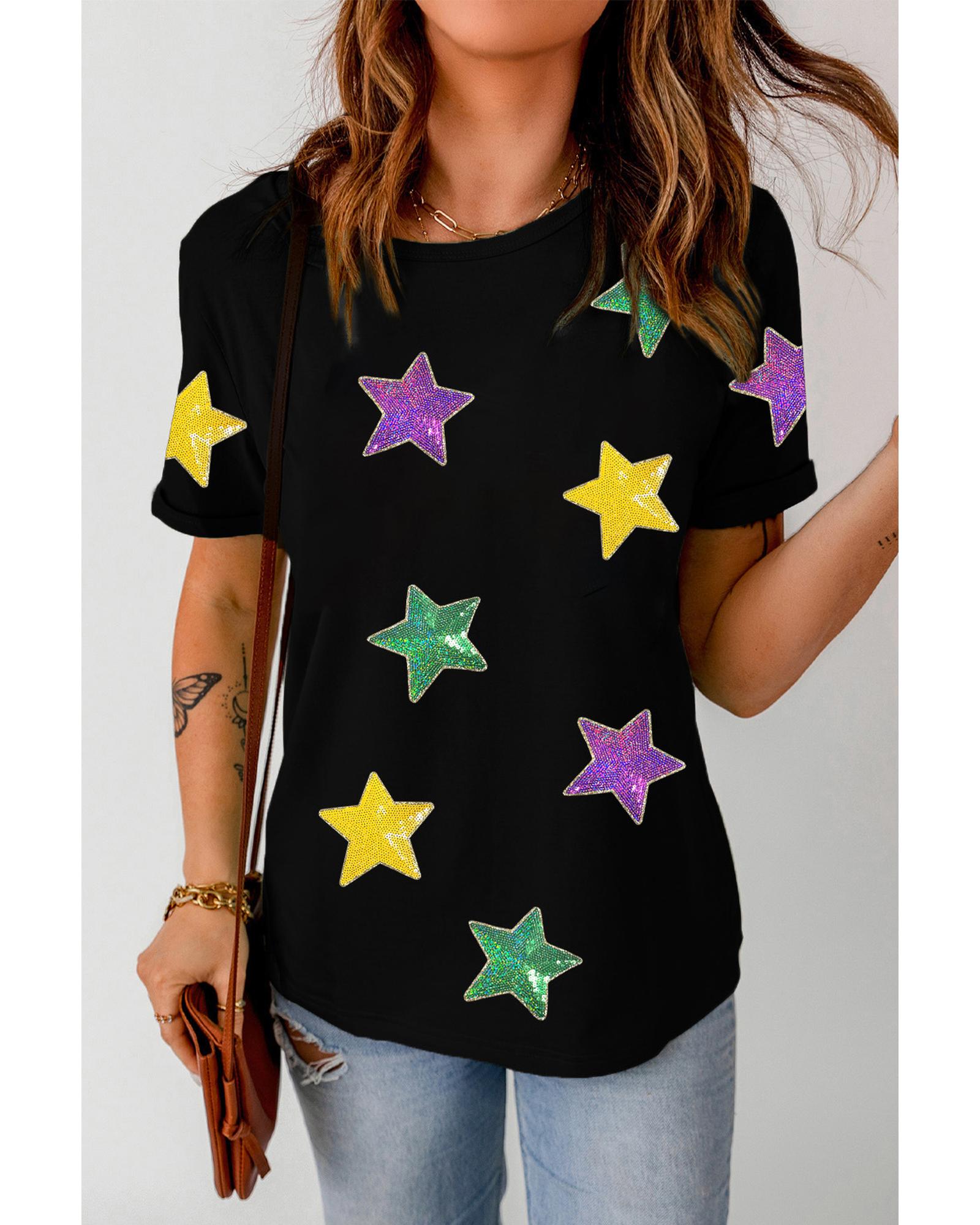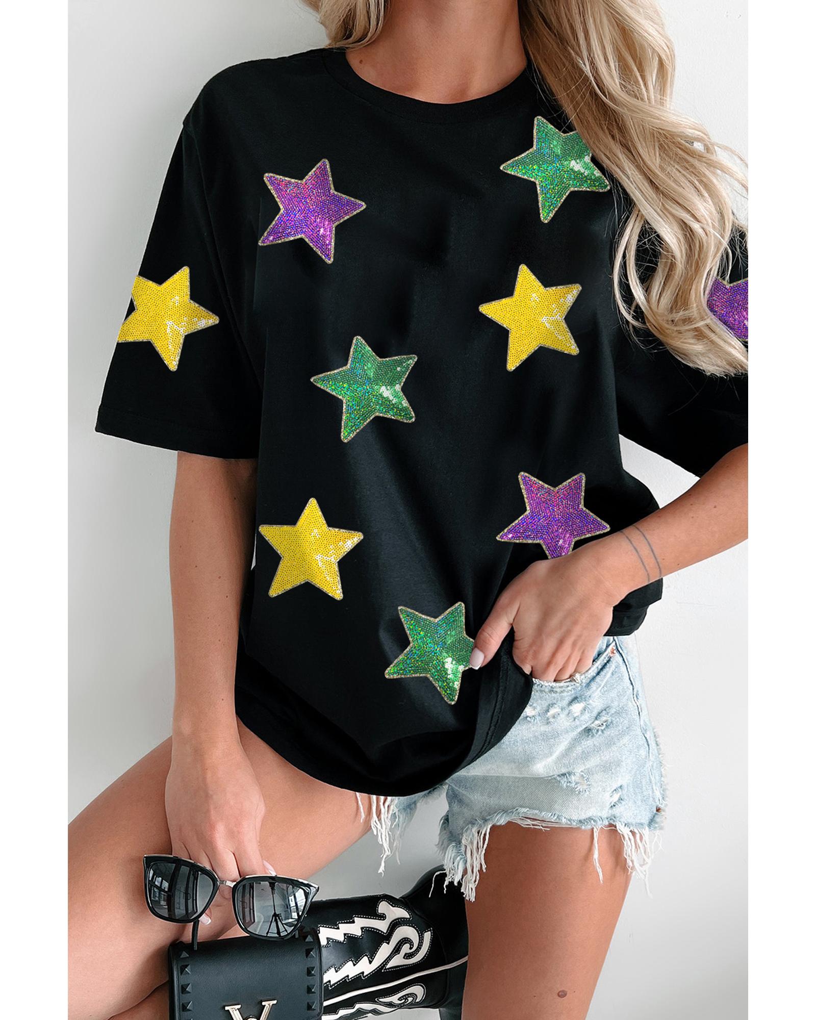Black Colorful Sequin Stars Patched Relaxed T Shirt – L