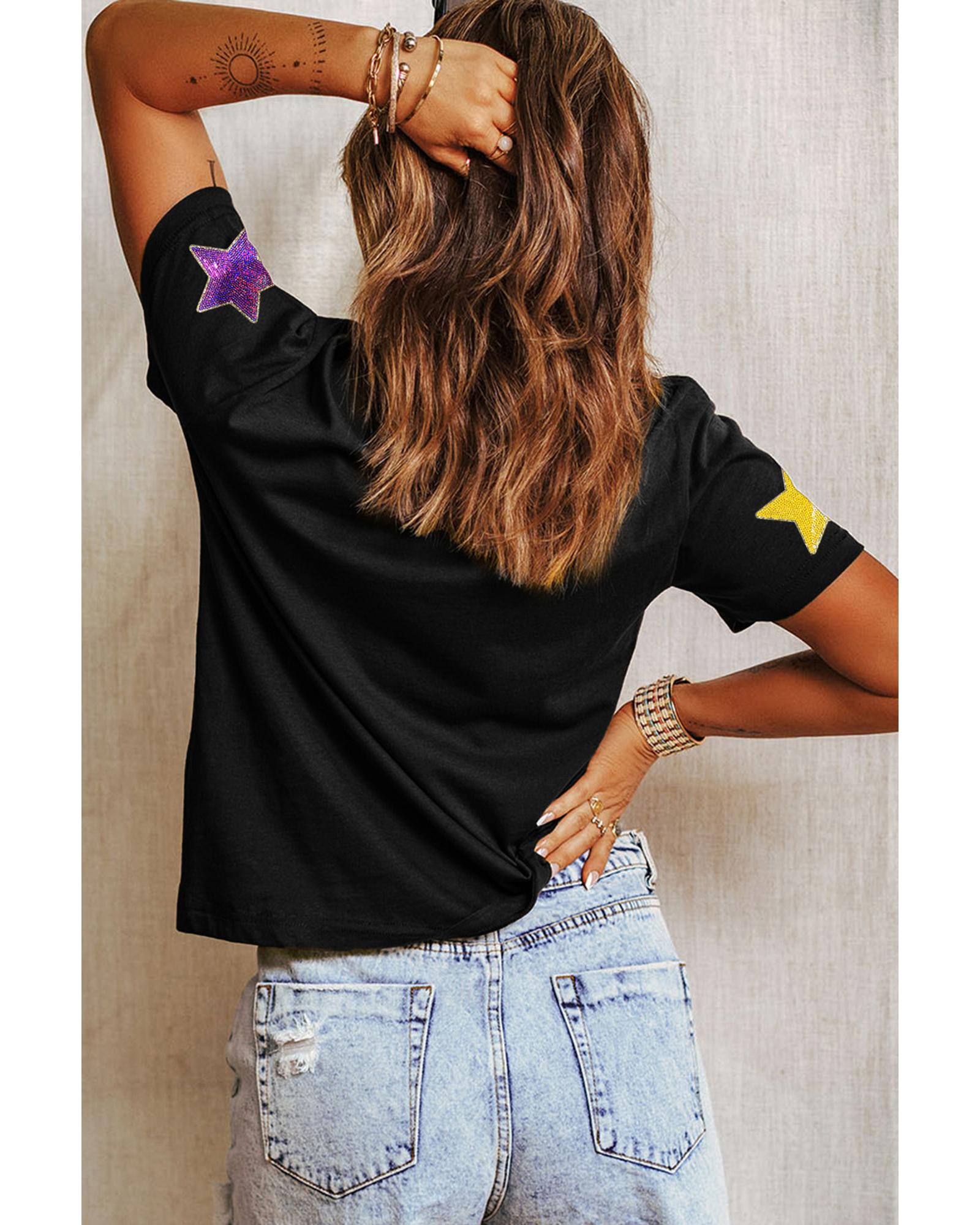 Black Colorful Sequin Stars Patched Relaxed T Shirt – M