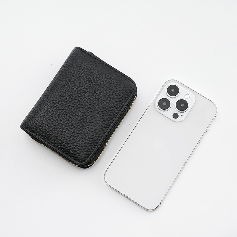 Black Compact RFID Genuine Leather Wallet for Women – Secure Zipper Card Holder & Coin Purse